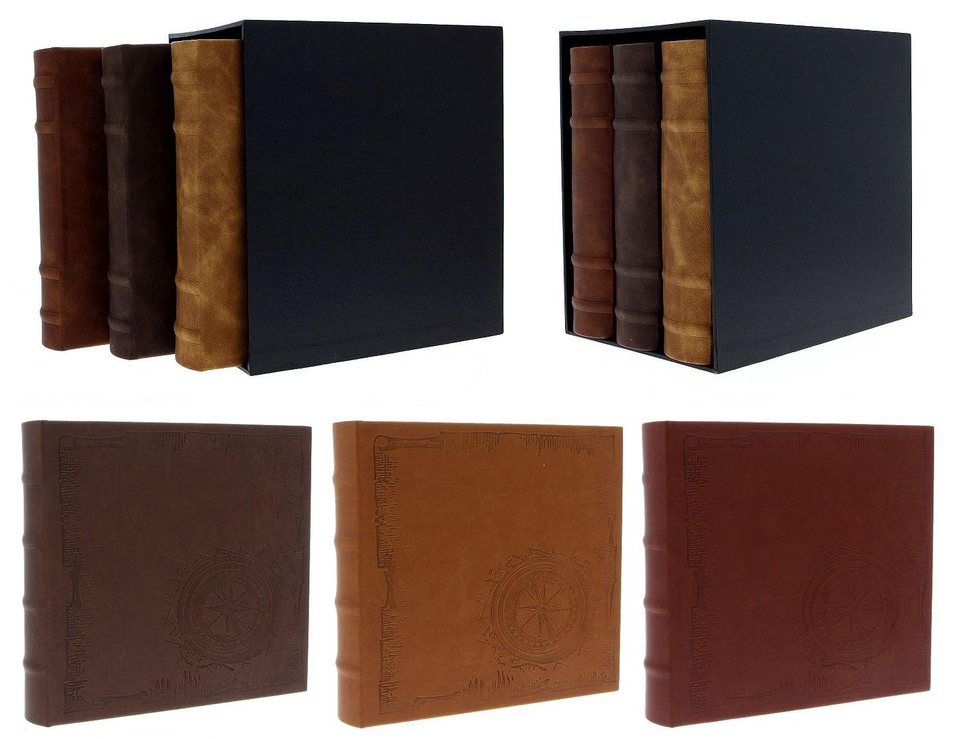 Komplet składa się z trzech albumów w różnych odcieniach brązu – od jasnego, piaskowego beżu, przez klasyczny brąz, po głęboki, mahoniowy odcień. Każdy z nich oprawiony jest w wysokiej jakości eko-skórę, której faktura przypomina stare, podróżnicze woluminy. Centralnym punktem okładki jest precyzyjnie wykonane tłoczenie w kształcie róży wiatrów, otoczone ramką stylizowaną na fragmenty starych map. Grzbiet każdego albumu jest szyty, co zapewnia jego wytrzymałość i pozwala na swobodne otwieranie na płasko.
