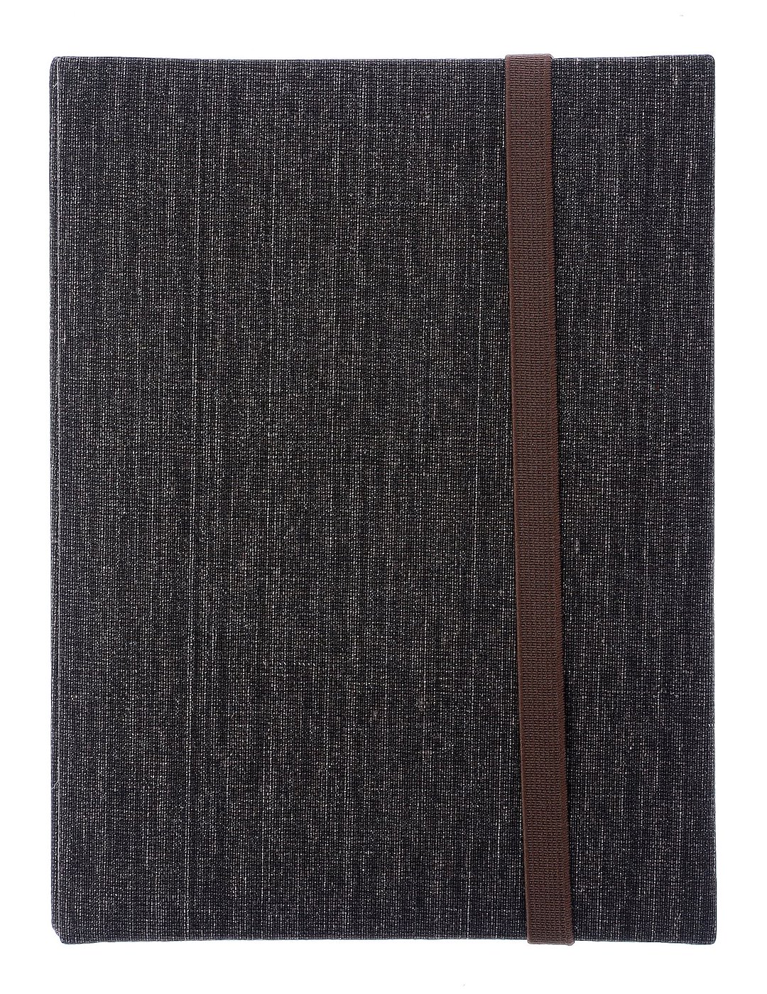 Okładka albumu została wykonana z twardej tektury i pokryta wysokiej jakości materiałem tekstylnym. Jego struktura przypomina grubo tkane, grafitowe płótno z widocznymi jaśniejszymi przetarciami, co nadaje mu surowego, a zarazem nowoczesnego charakteru. Kontrastująca, brązowa gumka nie tylko zabezpiecza album przed otwarciem, ale również stanowi ciekawy akcent kolorystyczny.