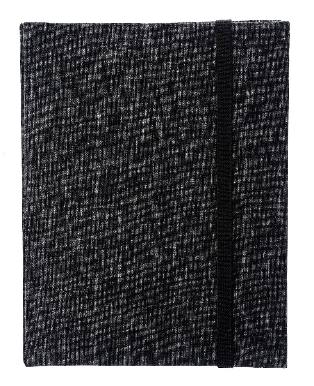 Okładka albumu została wykonana z twardej tektury introligatorskiej, co gwarantuje jej sztywność i wytrzymałość. Pokryto ją wysokiej jakości materiałem płóciennym o charakterystycznym splocie typu melanż. Czarno-szara faktura jest nie tylko estetyczna, ale również praktyczna – odporna na odciski palców i drobne zarysowania. Całość zamykana jest na szeroką, czarną gumkę, która utrzymuje album w zwartej formie i chroni zdjęcia przed wysunięciem.