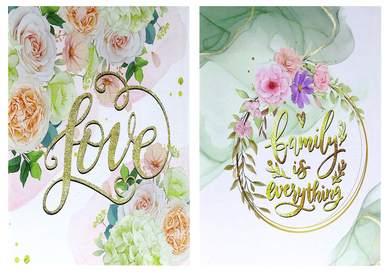 • Wzór 2: Kwiatowy wieniec z napisem "Family is everything" na tle zielonych akcentów.