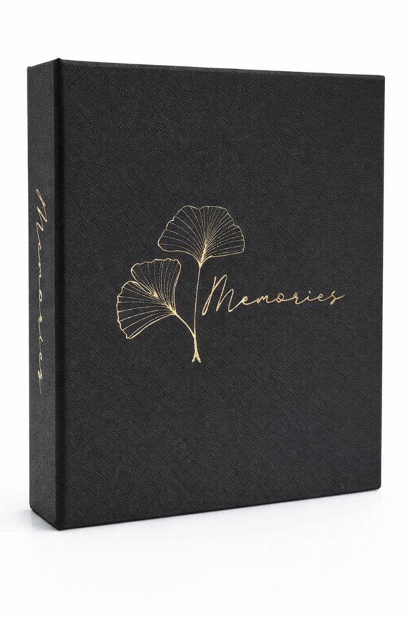 Prezentujemy album kieszeniowy marki GEDEON, który łączy w sobie wyrafinowany design z dużą pojemnością. Jego głęboka, czarna okładka wykonana z materiału CanvasTouch o wyczuwalnej fakturze płótna stanowi doskonałe tło dla złotego zdobienia. Centralnym punktem jest grafika przedstawiająca dwa liście miłorzębu japońskiego (ginkgo) oraz kaligraficzny napis 'Memories', wykonane metodą hot-stampingu, co nadaje im subtelny połysk i trwałość.