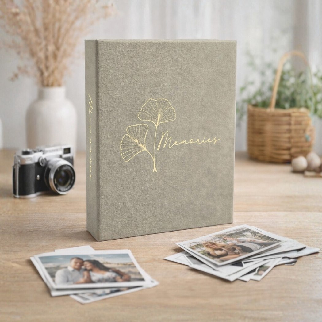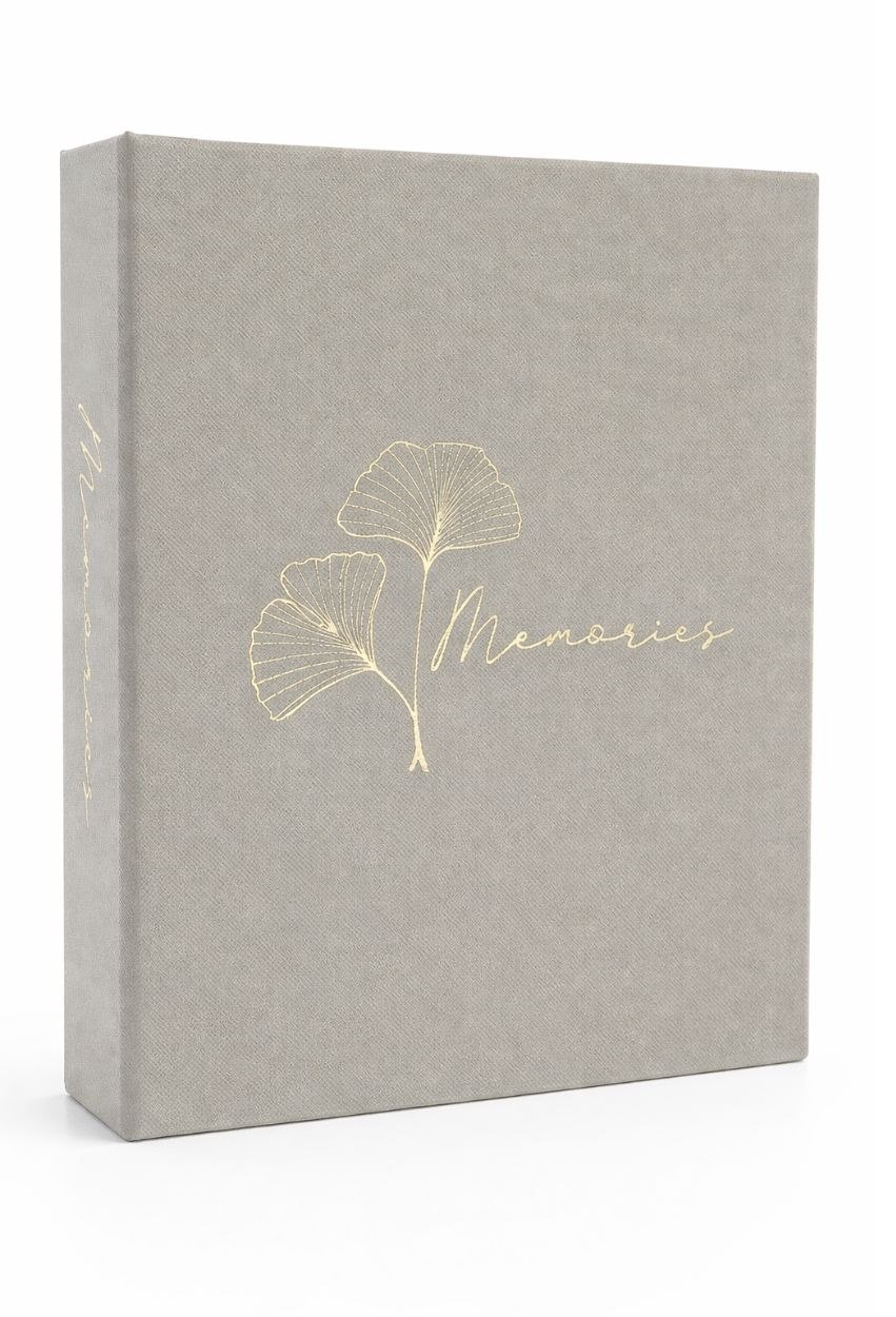Centralnym punktem okładki jest precyzyjne, złote tłoczenie przedstawiające dwa liście miłorzębu japońskiego oraz napis "Memories". Ten sam napis powtórzono na grzbiecie albumu, co nadaje mu spójny i luksusowy charakter. Wewnątrz znajdują się kieszenie pozwalające na łatwe i szybkie umieszczenie aż 304 zdjęć w standardowym formacie 10x15 cm. Klejony grzbiet zapewnia trwałość konstrukcji przy zachowaniu jej smukłej formy.