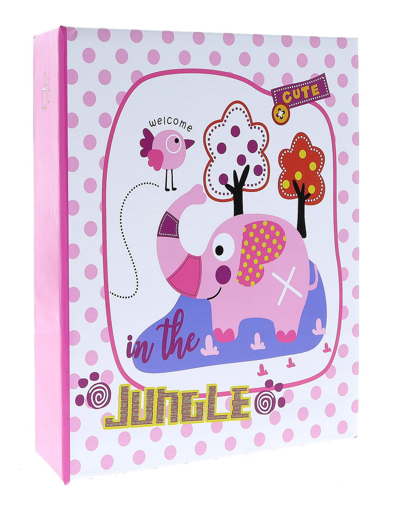 Okładka albumu wykonana jest z wysokiej jakości, twardego papieru introligatorskiego, który został dodatkowo zalaminowany. Zapewnia to nie tylko estetyczny wygląd, ale również zwiększoną odporność na zabrudzenia i uszkodzenia. Dominującym wzorem jest białe tło pokryte regularnymi, różowymi kropkami. Centralnym punktem jest kolorowa ilustracja przedstawiająca różowego słonika, ptaszka oraz napis "in the JUNGLE". Różowy grzbiet harmonijnie dopełnia całości.