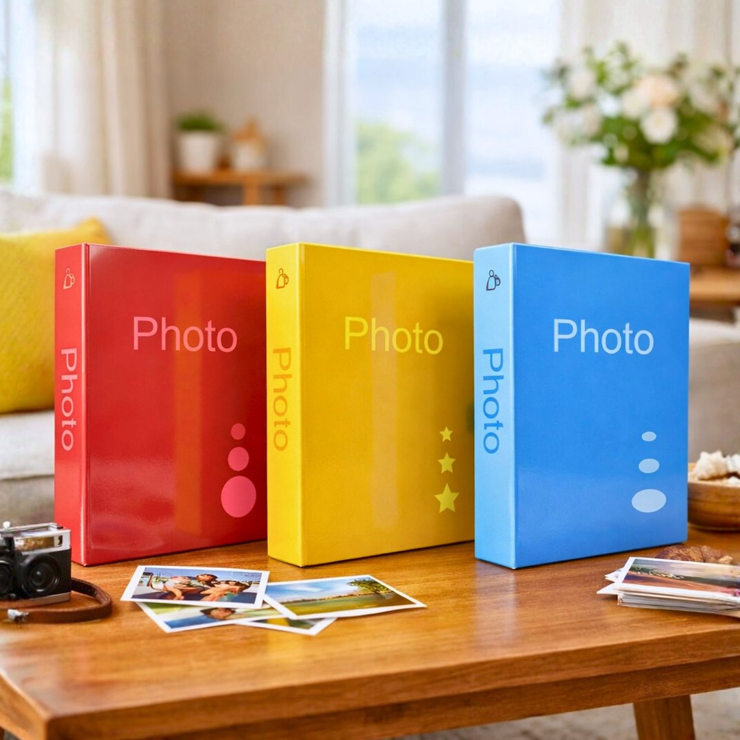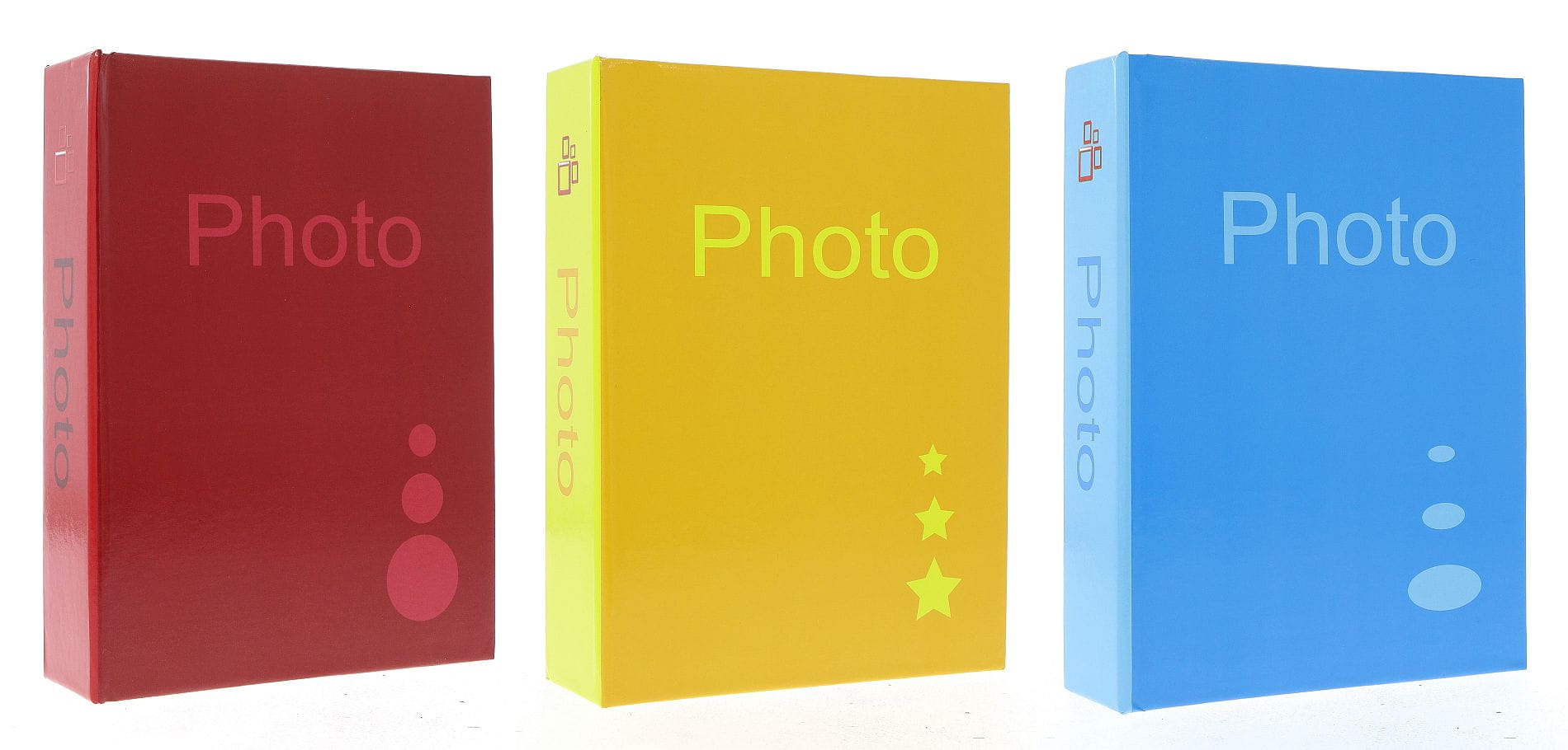 Okładka albumu wykonana jest z twardej, gładkiej okleiny o delikatnym połysku, która jest łatwa w czyszczeniu. Na froncie oraz na grzbiecie znajduje się minimalistyczny napis "Photo", a każdy wariant kolorystyczny (czerwony, żółty, niebieski) ozdobiony jest unikalną, subtelną grafiką - kółkami, gwiazdkami lub owalami. Solidny, klejony grzbiet zapewnia, że album będzie służył przez lata, nawet przy częstym przeglądaniu.