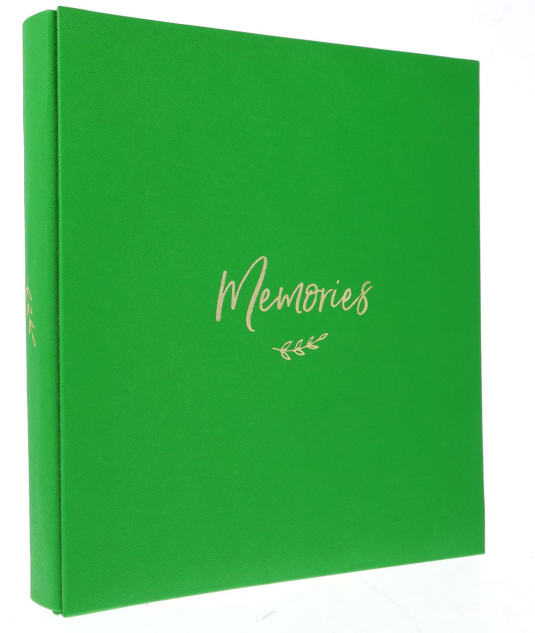 Okładka albumu przyciąga wzrok swoim intensywnie zielonym kolorem i subtelną, wyczuwalną w dotyku fakturą przypominającą płótno. Centralnym punktem jest elegancki, złoty napis "Memories" wykonany czcionką imitującą pismo odręczne, co dodaje całości osobistego charakteru. Twarda, solidna oprawa skutecznie chroni zawartość przed uszkodzeniami.