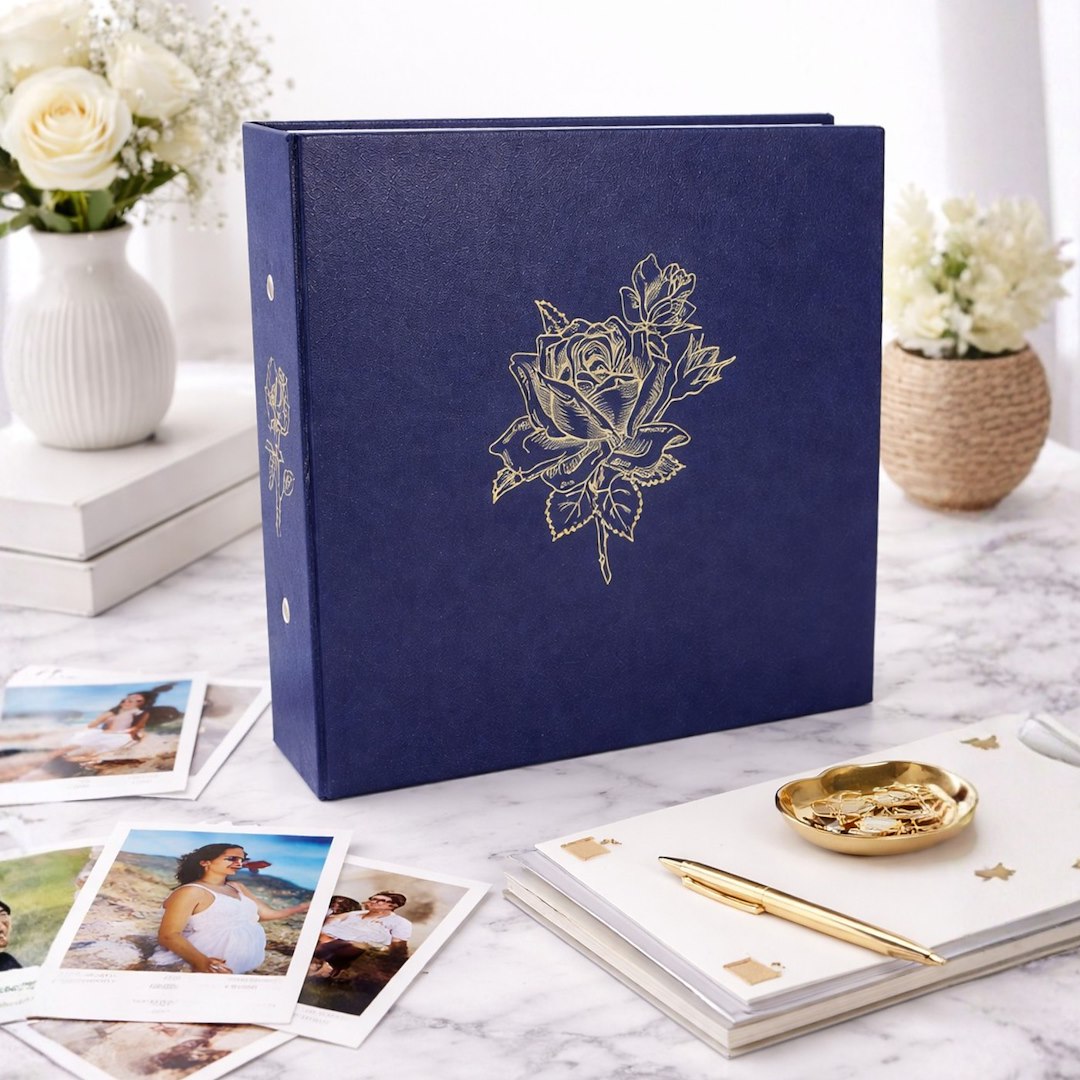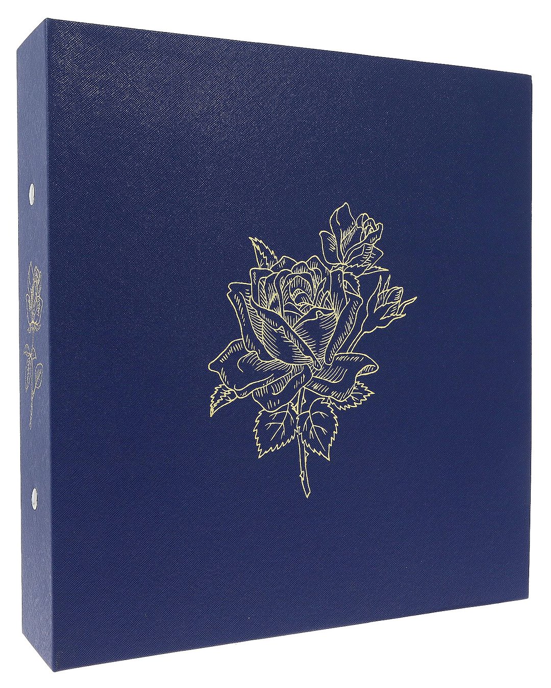 Okładka albumu została wykonana z wysokogatunkowej okleiny introligatorskiej w głębokim, granatowym kolorze. Jej powierzchnia ma subtelną, wyczuwalną w dotyku fakturę przypominającą naturalną skórę. Centralnym punktem frontu oraz grzbietu jest precyzyjnie wykonane, złote tłoczenie przedstawiające graficzny motyw róży, co nadaje całości szlachetnego charakteru.