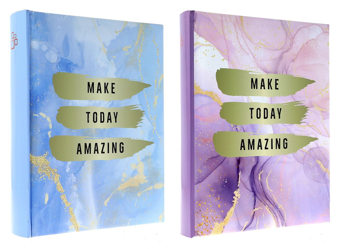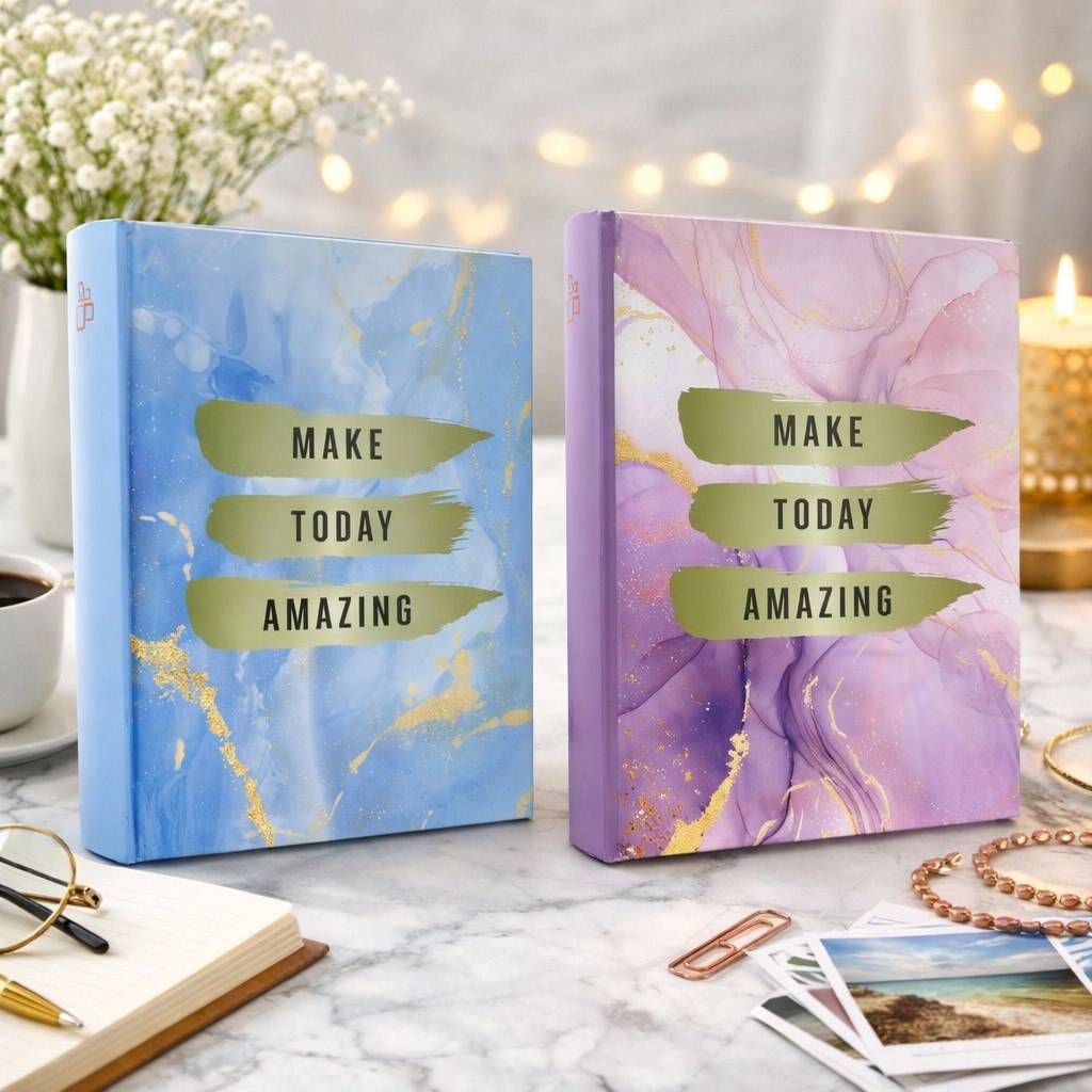 Przechowuj swoje fotografie w albumie, który sam w sobie jest dziełem sztuki. Okładka wykonana z laminowanego papieru introligatorskiego prezentuje nowoczesny, marmurkowy wzór wzbogacony o złote, nieregularne żyłki. Centralnym punktem jest motywacyjny napis „MAKE TODAY AMAZING”, umieszczony na tle trzech pociągnięć pędzla w kolorze oliwkowej zieleni. Produkt dostępny jest w dwóch wariantach kolorystycznych: chłodnym błękicie i ciepłym fiolecie.