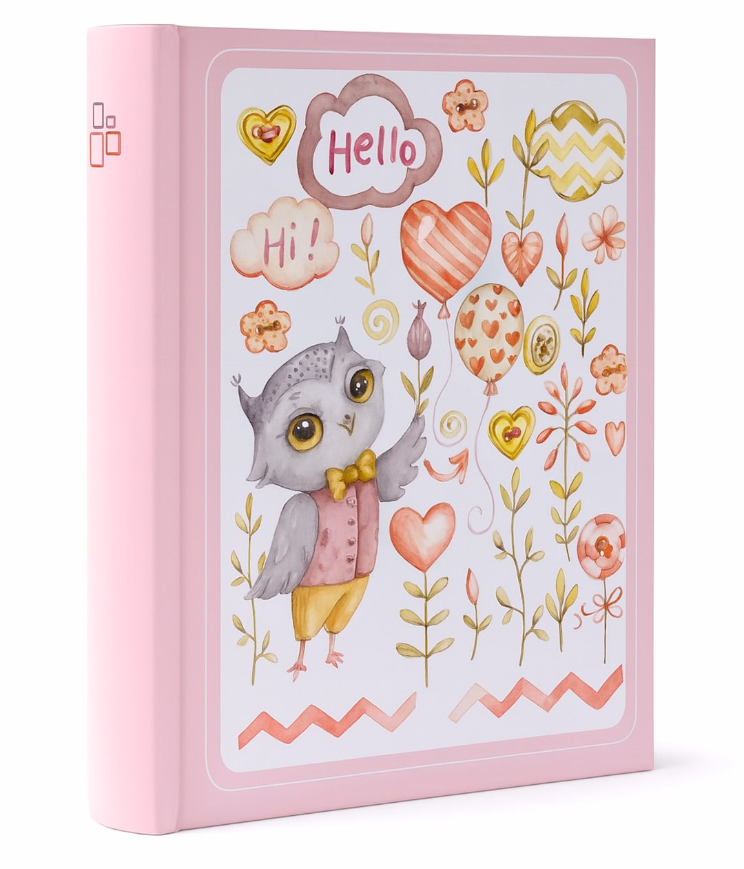 Okładka albumu wykonana jest z wysokiej jakości papieru introligatorskiego, który został dodatkowo zalaminowany. Zapewnia to nie tylko piękny, gładki wygląd, ale także odporność na zabrudzenia i wilgoć. Dominujący pastelowy róż stanowi tło dla uroczej, akwarelowej grafiki przedstawiającej sówkę w różowej kamizelce i muszce, otoczoną balonikami, serduszkami i kwiatami.