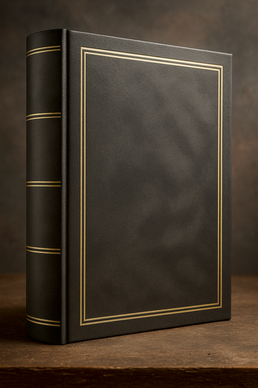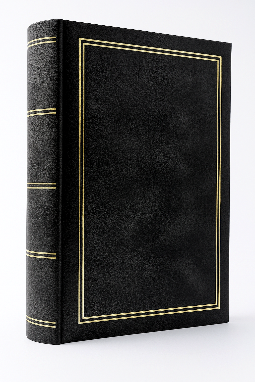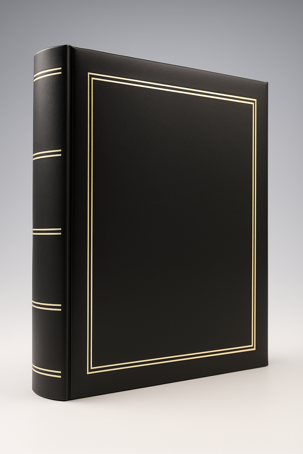 Okładka albumu wykonana jest z wysokiej jakości czarnej okleiny winylowej, która doskonale imituje fakturę naturalnej skóry. Jest nie tylko estetyczna, ale również odporna na zabrudzenia i łatwa w czyszczeniu. Centralnym punktem designu jest subtelne, podwójne tłoczenie w kolorze złota, tworzące klasyczną ramkę, która dodaje całości szlachetnego charakteru.