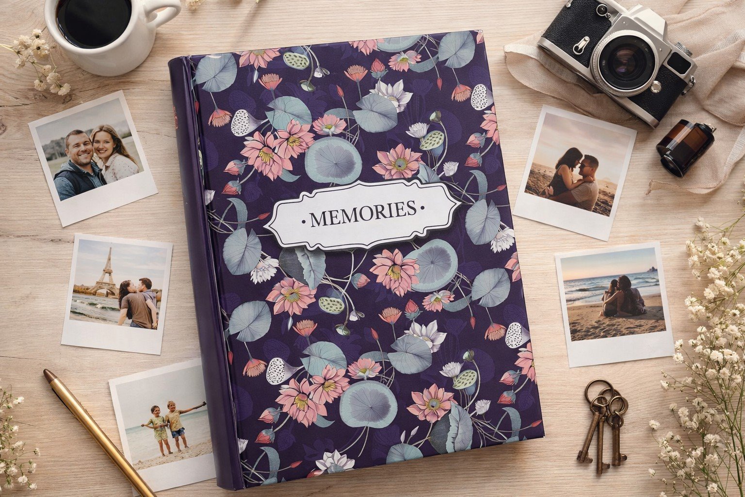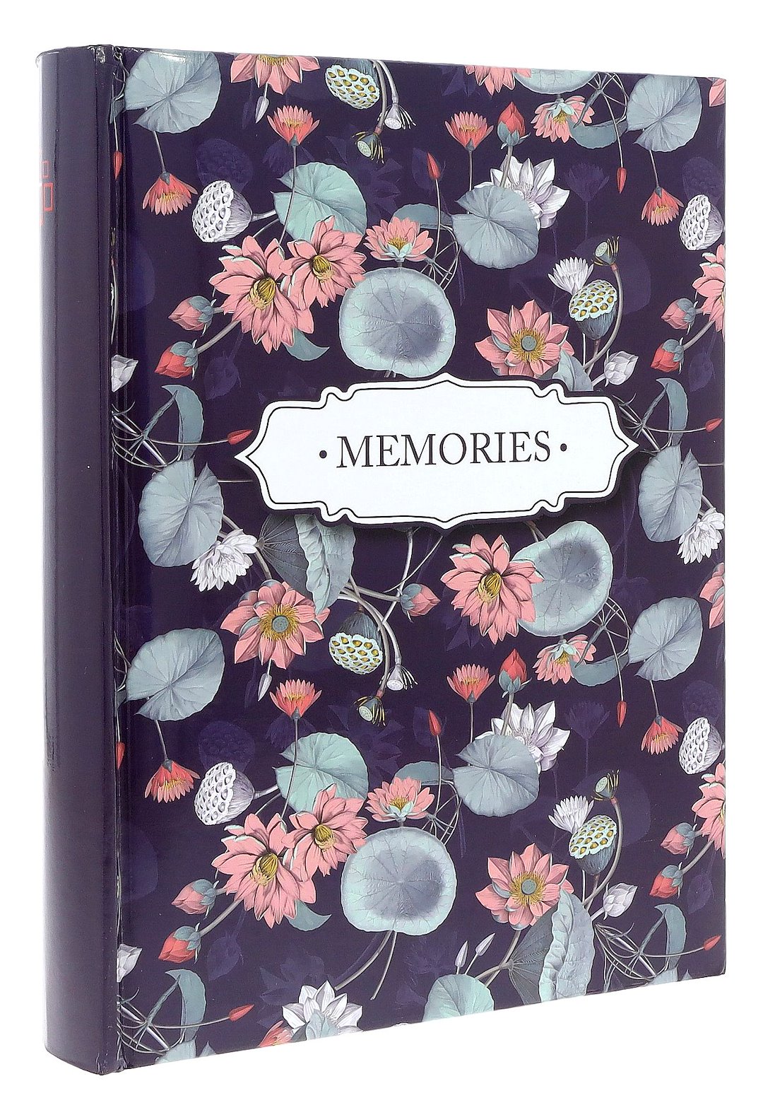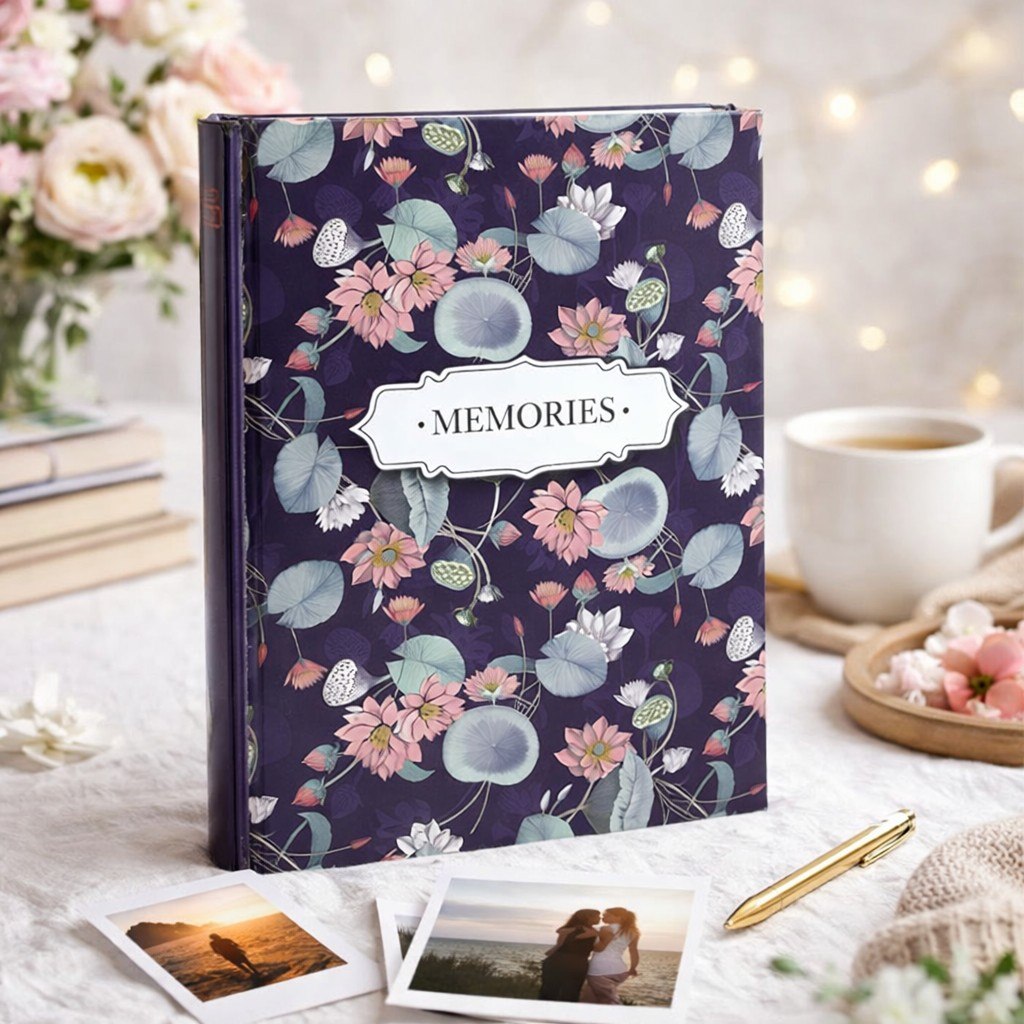 Prezentujemy album kieszeniowy, który łączy w sobie funkcjonalność z unikalnym designem. Okładka w kolorze głębokiego, nasyconego fioletu (granatu) stanowi tło dla misternego wzoru przedstawiającego różowe kwiaty lotosu, ich zielono-niebieskie liście oraz pąki. Całość kompozycji dopełniają subtelne, białe motyle, dodające lekkości. Centralnym punktem jest ozdobna, biała etykieta z napisem „MEMORIES”, która podkreśla pamiątkowy charakter albumu.