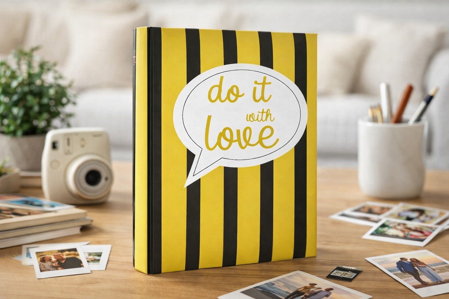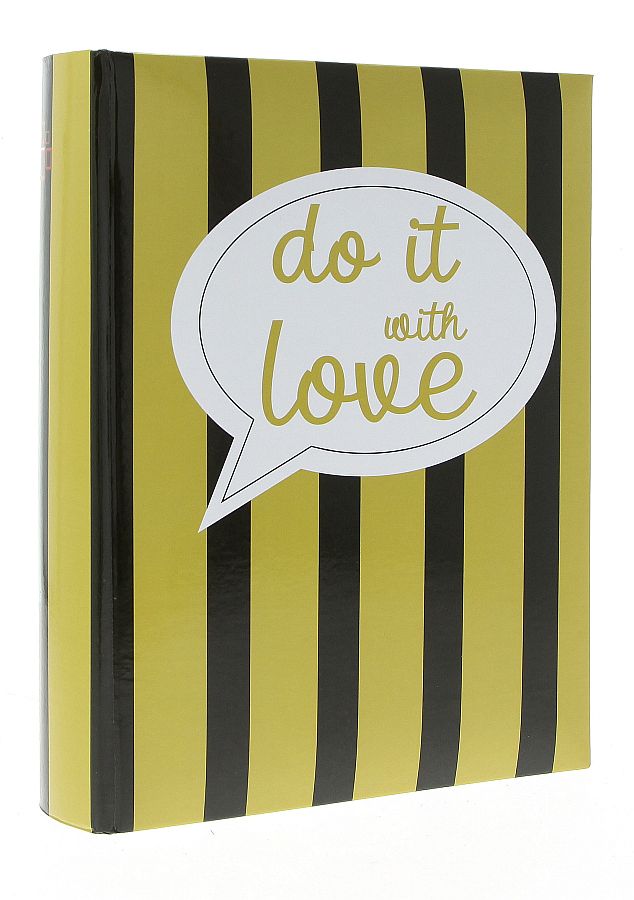 Okładka albumu została wykonana z wysokiej jakości papieru introligatorskiego, pokrytego gładką, błyszczącą warstwą laminatu. Dominujący wzór to szerokie, pionowe pasy w kontrastujących kolorach – energetycznym żółtym i głębokiej czerni. Centralnym punktem jest biały dymek komiksowy z ozdobnym, złotym napisem 'do it with love', który dodaje całości nowoczesnego i pozytywnego charakteru.