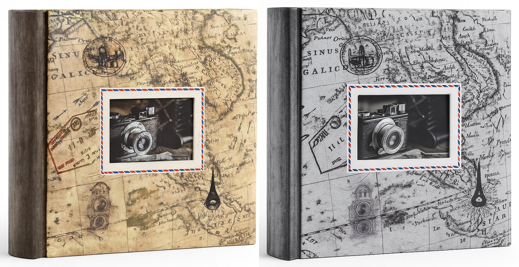 Okładka albumu wykonana jest z wysokiej jakości materiału o fakturze płótna, na którym nadrukowano wzór stylizowany na starą mapę świata. Na froncie znajduje się praktyczne okienko o wymiarach 7x9 cm, otoczone ramką przypominającą list lotniczy. Możesz w nim umieścić swoje ulubione zdjęcie, nadając albumowi w pełni osobisty charakter. Grzbiet w kontrastującym, ciemnoszarym kolorze dodaje całości elegancji.
