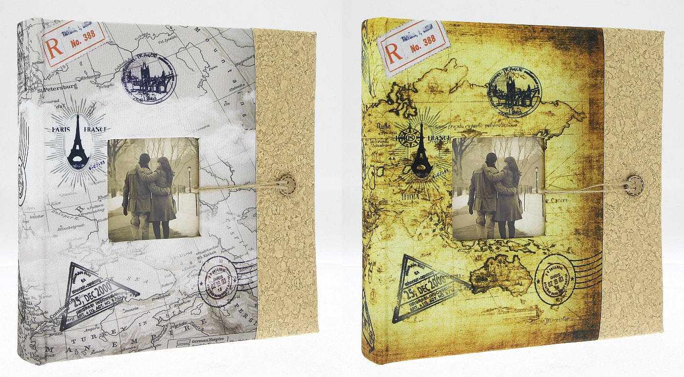 Okładka albumu to prawdziwe dzieło sztuki użytkowej. Wykonana z trwałej eko-skóry, przedstawia motyw mapy świata ozdobiony klimatycznymi stemplami pocztowymi, nawiązującymi do klasycznych podróży. Centralnie umieszczone okienko pozwala na wstawienie własnego zdjęcia, nadając albumowi osobisty charakter. Prawa część okładki posiada fakturę przypominającą korek, a całość zamykana jest na stylowy sznurek z guzikiem, co dodatkowo podkreśla jego vintage'owy styl.