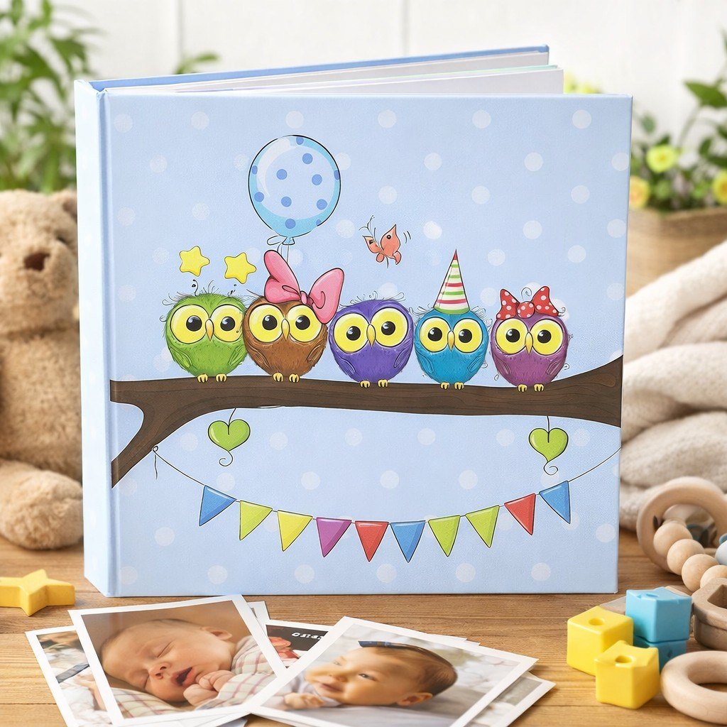 Okładka albumu to prawdziwa uczta dla oczu. Wykonana z twardej tektury introligatorskiej, pokryta jest gładkim, laminowanym papierem w pogodnym, błękitnym kolorze, ozdobionym delikatnymi, białymi kropkami. Centralnym punktem jest urocza, kolorowa ilustracja przedstawiająca pięć sympatycznych sówek siedzących na gałęzi. Każda sówka ma swój unikalny charakter, a cała scena uzupełniona jest o elementy takie jak balonik, girlanda i gwiazdki, tworząc radosną, imprezową atmosferę. Twarda oprawa chroni zawartość przed uszkodzeniami i zagnieceniami.