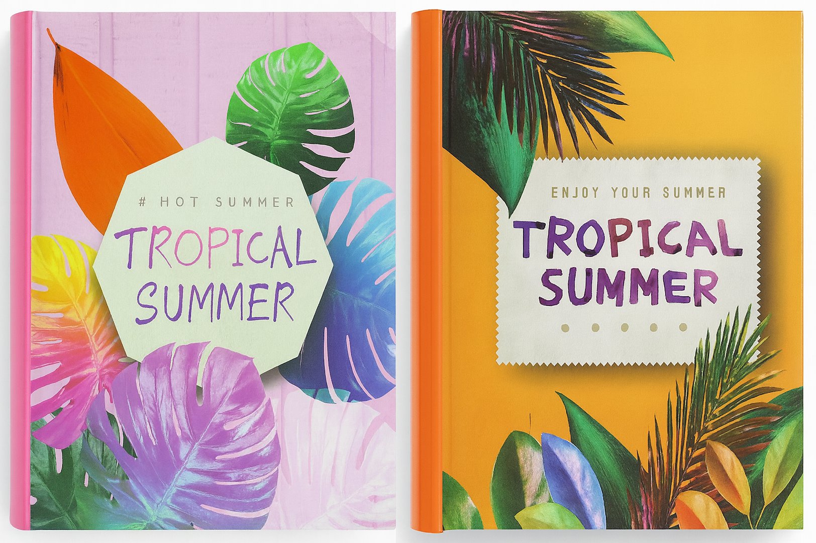 • Wariant pomarańczowy: Energetyczna okładka z motywem zielonych liści palmy i monstery, z centralnie umieszczonym napisem 'TROPICAL SUMMER'.