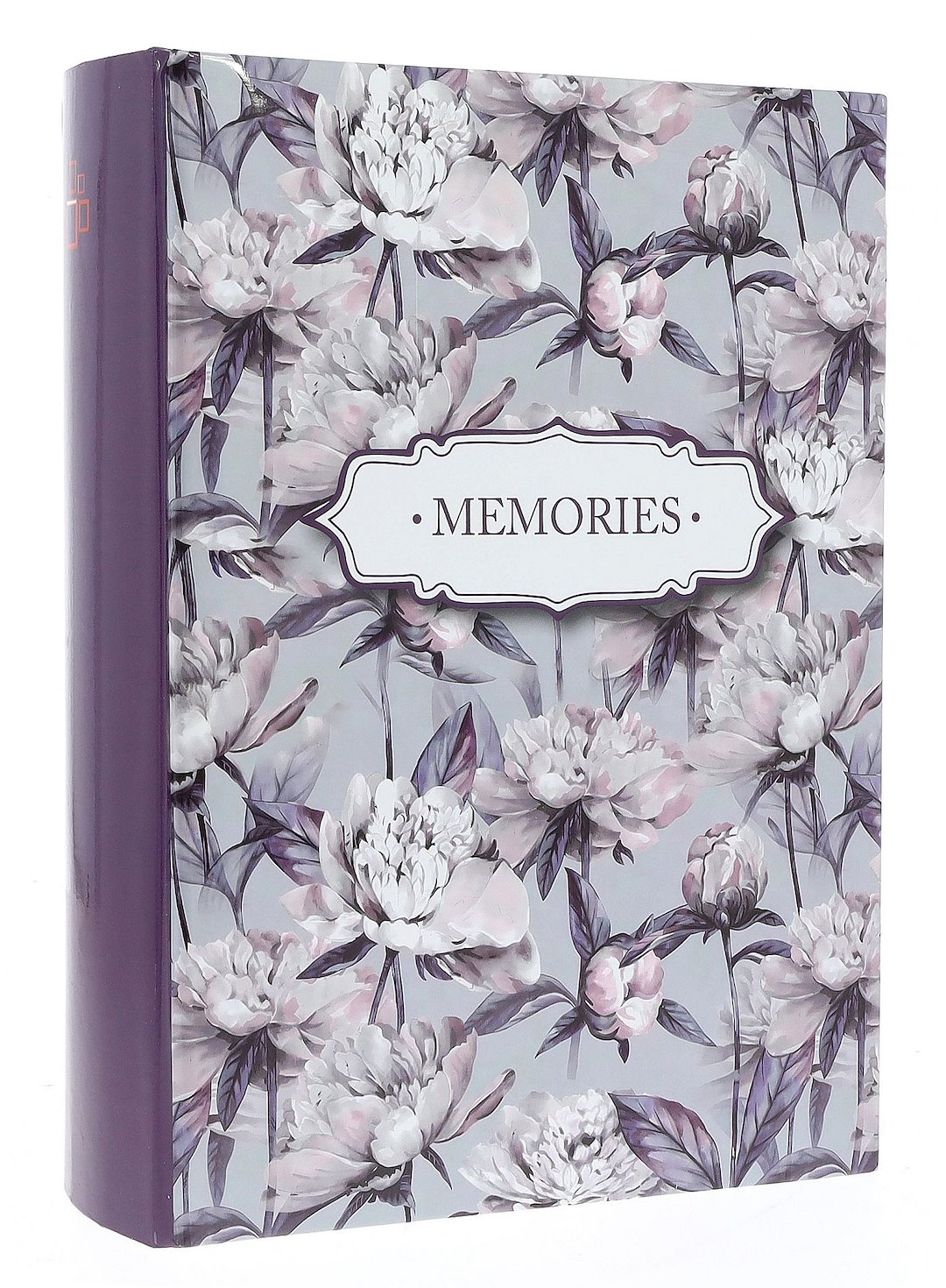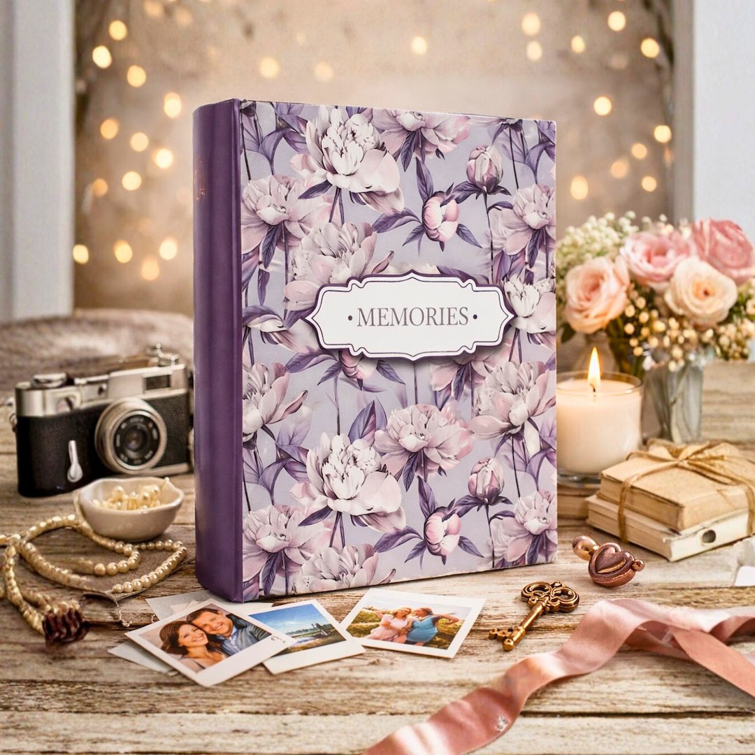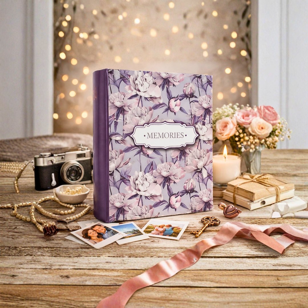 Okładka albumu została wykonana z wysokiej jakości papieru laminowanego, co zapewnia jej odporność na zabrudzenia i wilgoć. Zdobi ją subtelny, kwiatowy wzór przedstawiający piwonie w odcieniach fioletu i pudrowego różu na jasnoszarym tle. Grzbiet w jednolitym, głębokim fiolecie stanowi eleganckie dopełnienie całości. Na froncie umieszczono ozdobną etykietę z napisem "Memories", nadając albumowi klasycznego charakteru.
