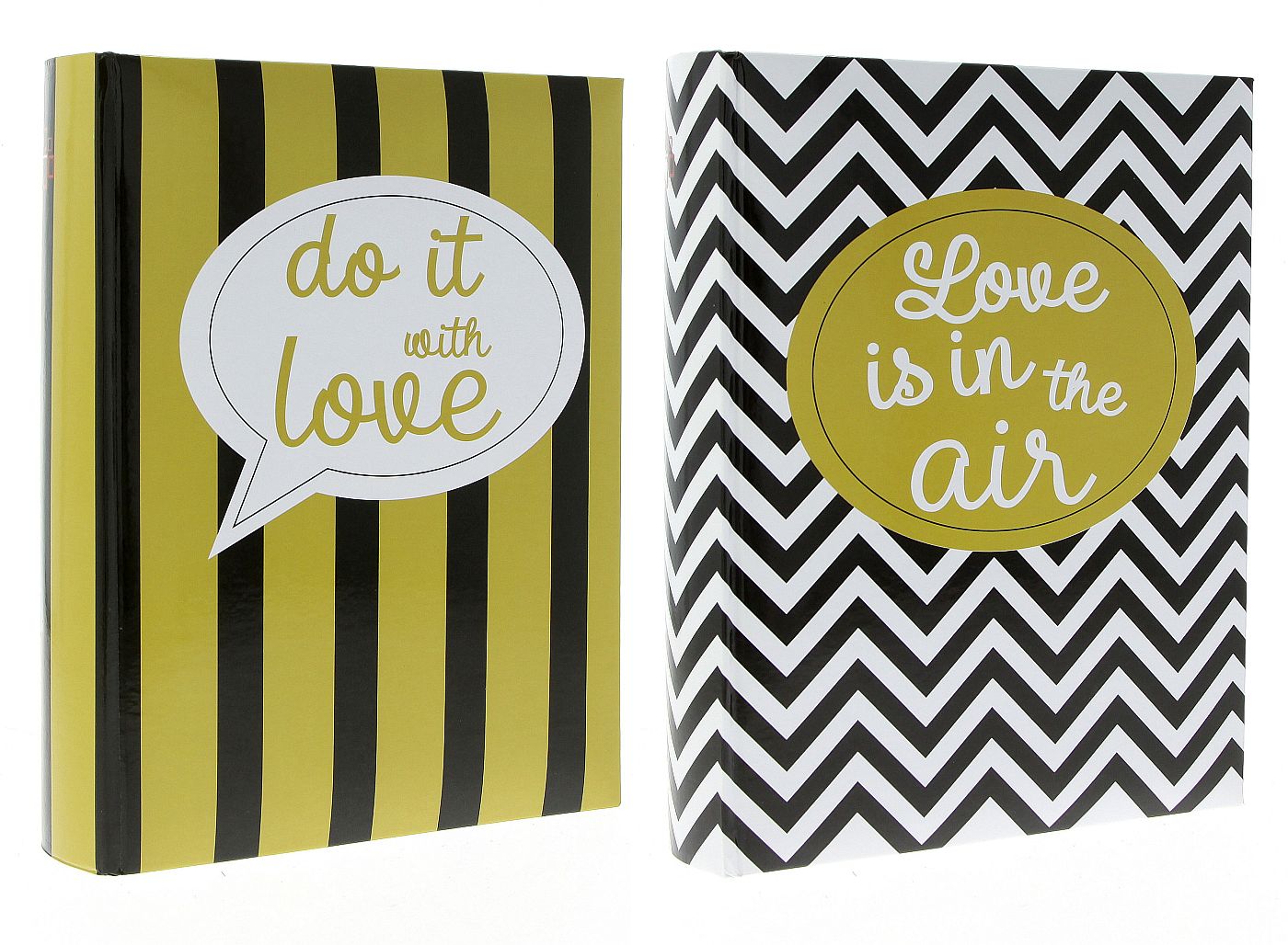 Album dostępny jest w dwóch wyrazistych, graficznych wersjach, które doskonale wpisują się w nowoczesne trendy. Pierwszy model posiada okładkę w pionowe, czarno-złote pasy z centralnie umieszczonym napisem "do it with love" w białym dymku. Druga opcja to dynamiczny, czarno-biały wzór chevron (zygzak) z okrągłą, złotą aplikacją i hasłem "Love is in the air". Okładka wykonana jest z gładkiego, laminowanego papieru introligatorskiego, co zapewnia jej estetyczny wygląd i odporność na drobne zabrudzenia.