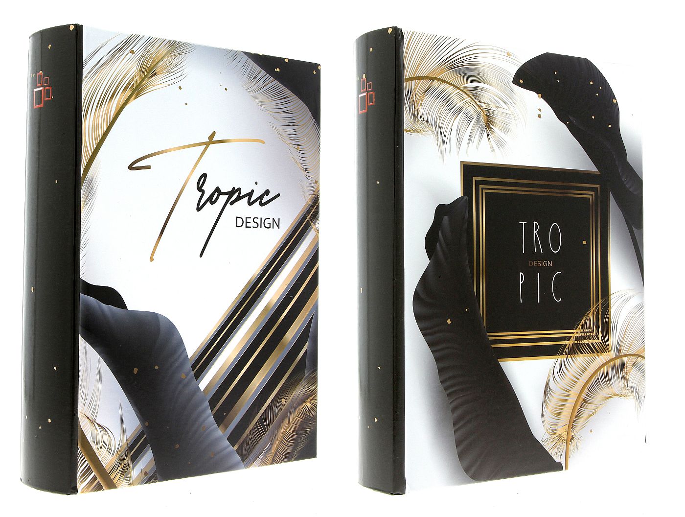 Przedstawiamy album, który jest czymś więcej niż tylko miejscem na zdjęcia. To opowieść zamknięta w twardej oprawie, inspirowana egzotyczną estetyką. Okładka wykonana z wysokiej jakości papieru introligatorskiego zachwyca kontrastem głębokiej czerni, czystej bieli i lśniącego złota. Grafika przedstawia kompozycję stylizowanych piór i liści, uzupełnioną o złoty, kaligraficzny napis "Tropic Design".