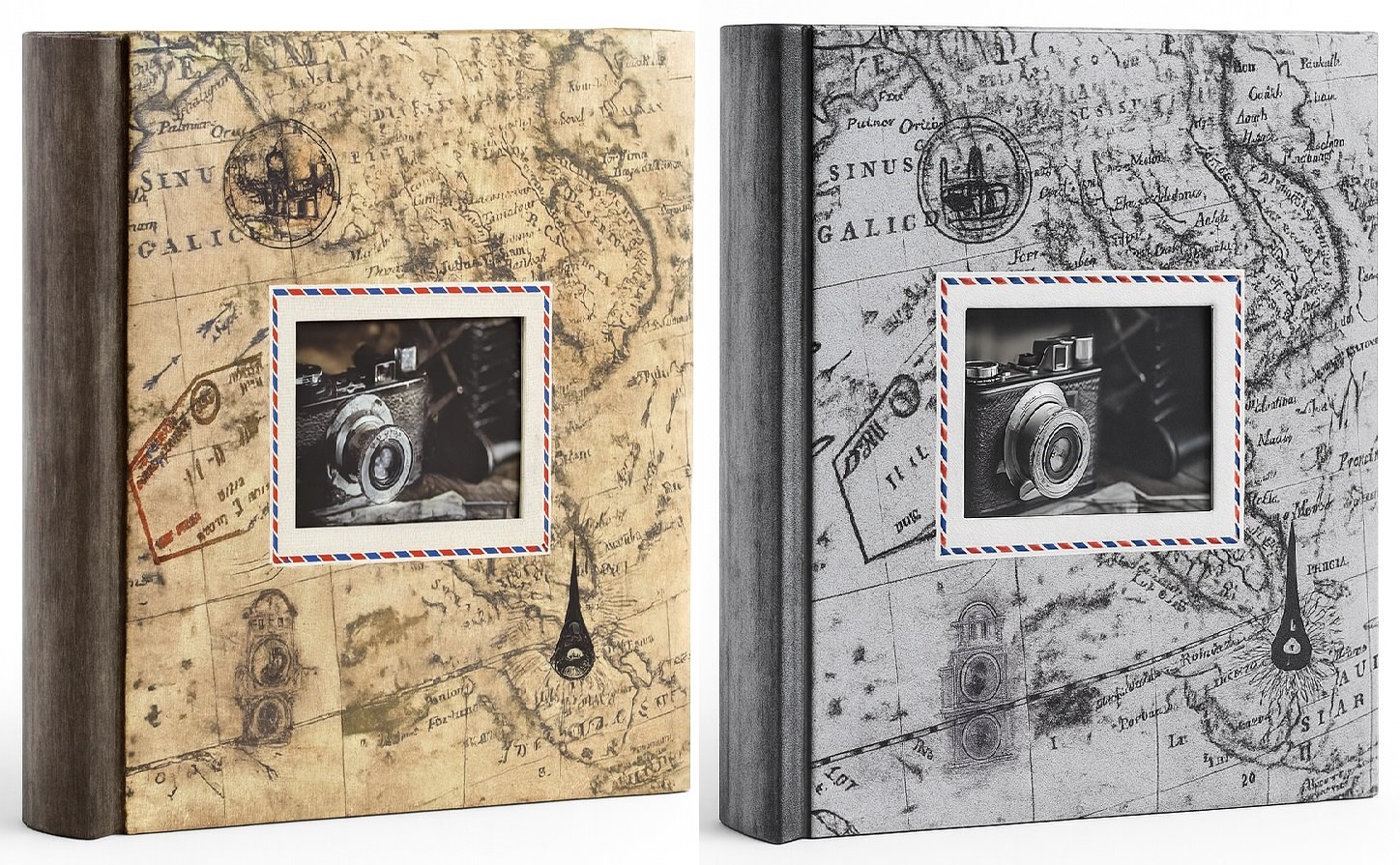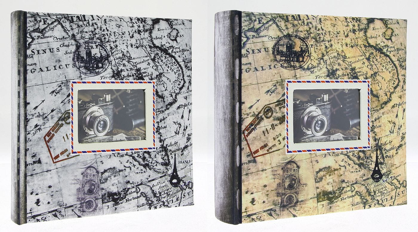 Okładka albumu wykonana jest z wysokiej jakości materiału o fakturze płótna, co nadaje jej szlachetny i trwały wygląd. Nadruk przedstawia stylizowaną, starą mapę świata, dostępną w dwóch wariantach kolorystycznych: sepii oraz skali szarości. Grzbiet albumu, również płócienny, w kontrastującym, ciemnym kolorze, dodaje elegancji. Centralnym punktem okładki jest okienko, w którym możesz umieścić własne, ulubione zdjęcie, nadając albumowi w pełni osobisty charakter.