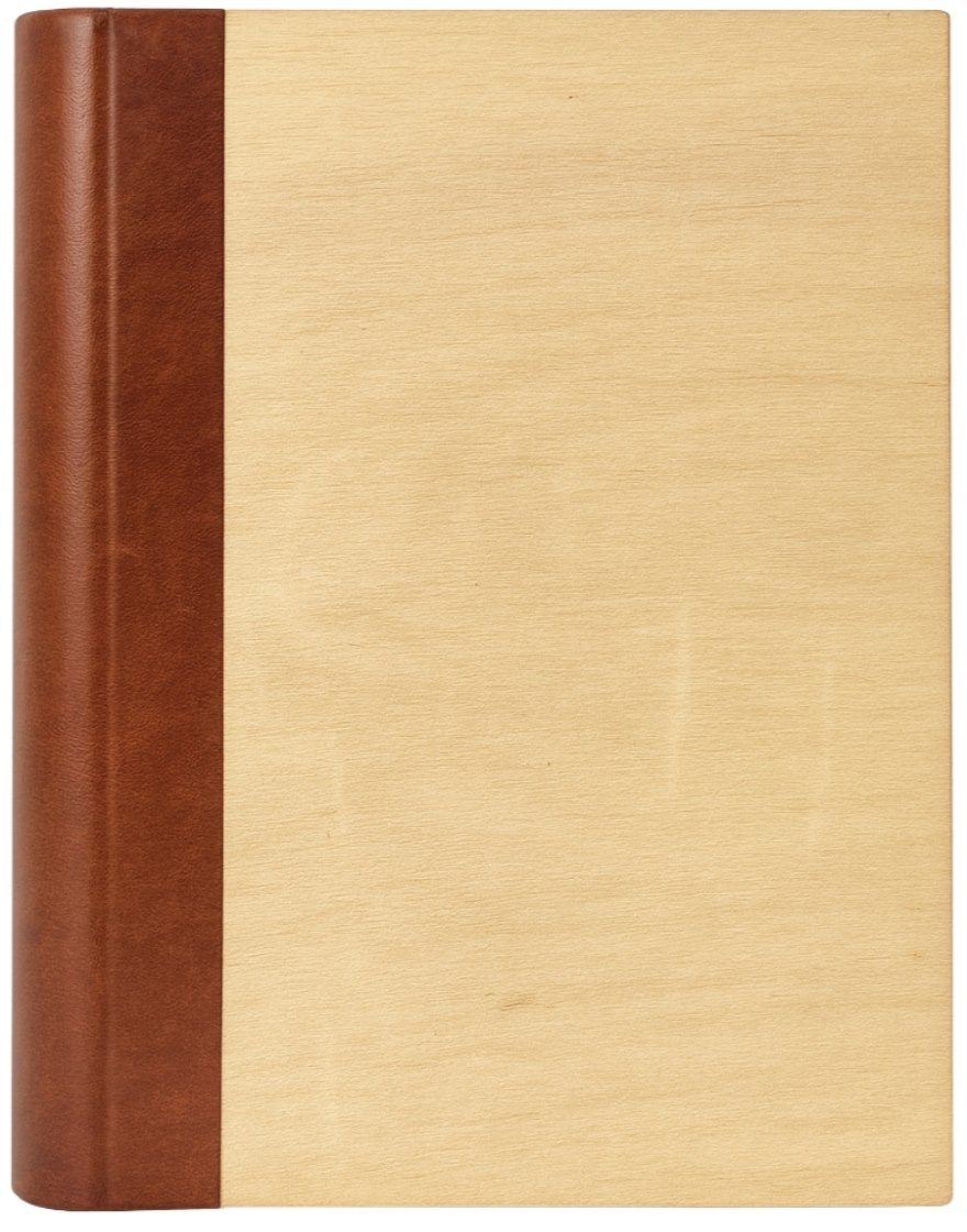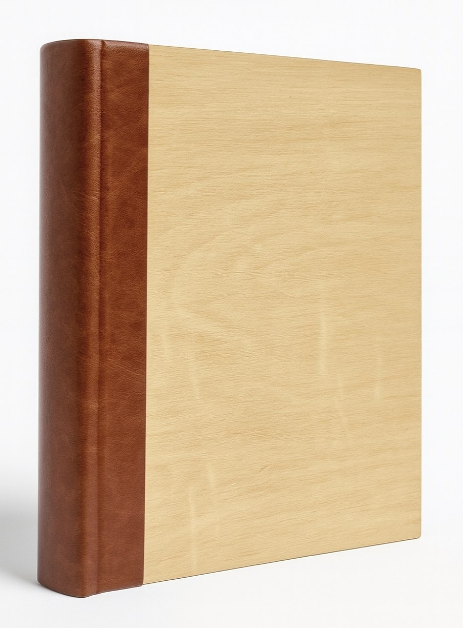 Album Gedeon KD46300/2WOODBRONZE to połączenie tradycyjnego rzemiosła i naturalnej estetyki. Okładka wykonana jest z dwóch harmonijnie dobranych materiałów. Grzbiet pokryty jest gładką eko-skórą w ciepłym, brązowym odcieniu, co nadaje albumowi szlachetnego, książkowego charakteru. Front i tył okładki zdobi okleina o wyglądzie i fakturze jasnego drewna z wyraźnie zaznaczonymi słojami, wprowadzając do projektu element natury i ciepła.