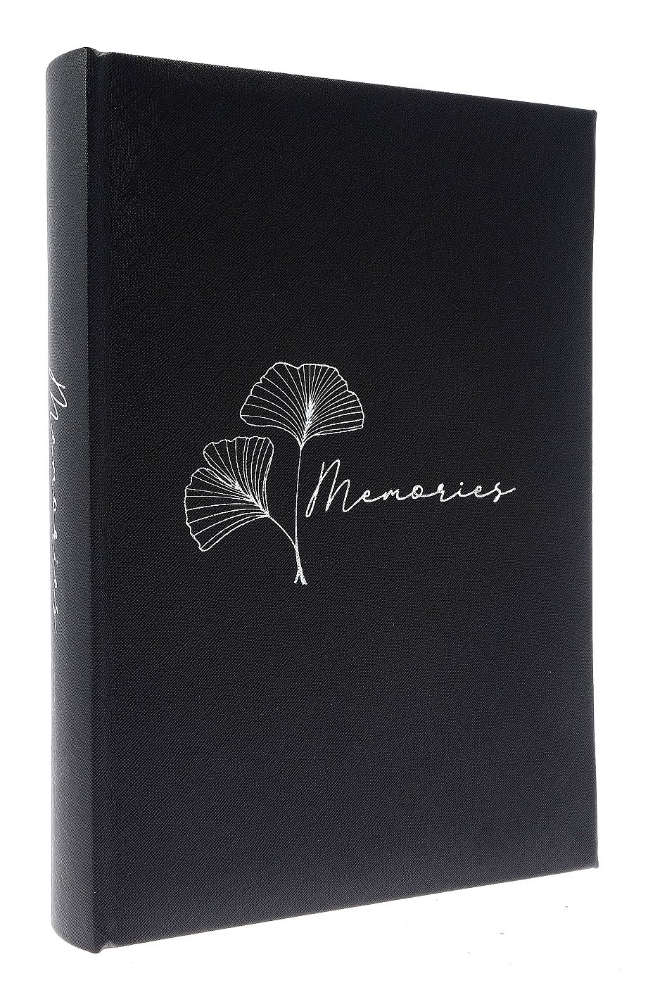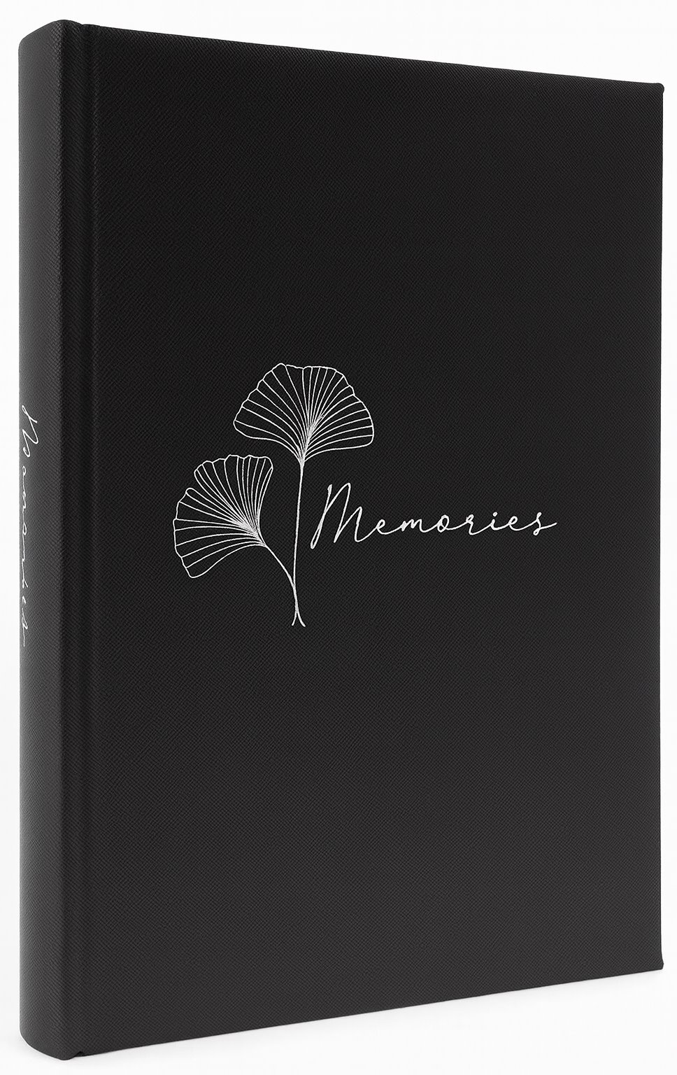 Okładkę wykonano z wysokiej jakości skóry syntetycznej CanvasTouch w głębokim, czarnym kolorze. Jej charakterystyczna faktura przypominająca płótno jest nie tylko przyjemna w dotyku, ale również odporna na codzienne użytkowanie. Centralnym punktem jest subtelny, biały nadruk przedstawiający liście miłorzębu japońskiego oraz elegancki napis "Memories", który powtórzono również na grzbiecie albumu.