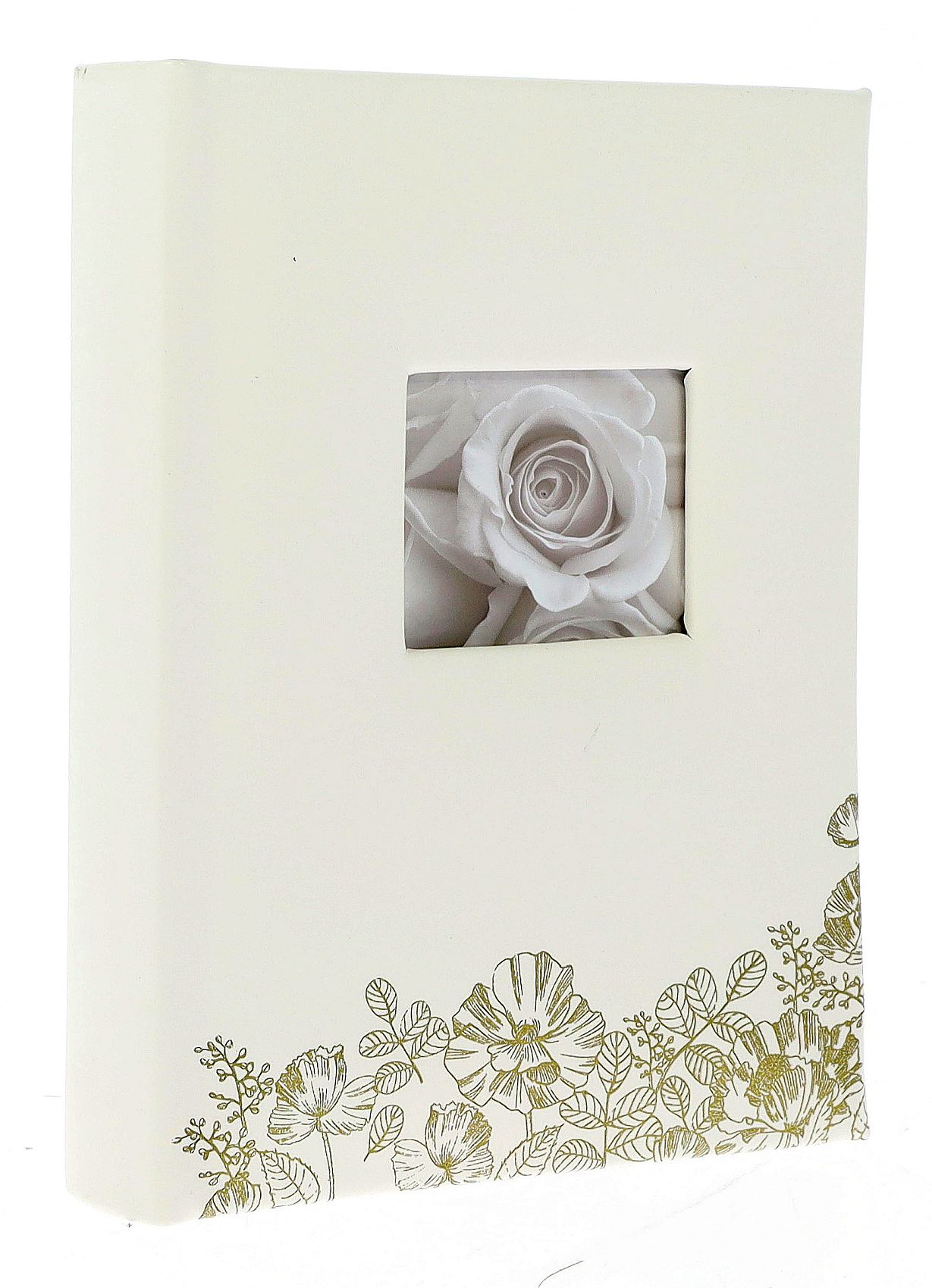 Album z kolekcji Moment01 marki Gedeon to propozycja dla osób ceniących sobie klasyczny design z nutą nowoczesnej elegancji. Okładka wykonana z gładkiej ekoskóry w subtelnym kolorze écru stanowi doskonałe tło dla złotego, brokatowego wzoru polnych kwiatów, który zdobi jej dolną część. Tłoczenie jest precyzyjnie wykonane i mieni się w świetle, dodając całości luksusowego charakteru.