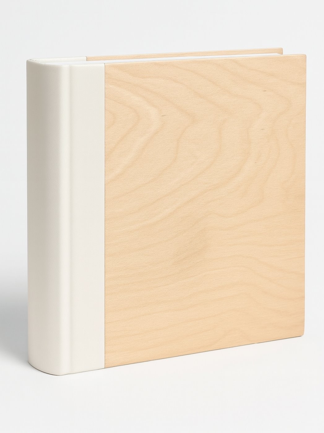Okładka albumu została wykonana z wysokiej jakości skóry ekologicznej, która wiernie imituje fakturę i usłojenie jasnego drewna. Kontrastujący, gładki grzbiet w kolorze białym dodaje całości elegancji i lekkości. Kluczowym elementem konstrukcyjnym jest szyty grzbiet, który gwarantuje, że album będzie służył przez lata, a jego karty pozostaną na swoim miejscu nawet przy intensywnym użytkowaniu.