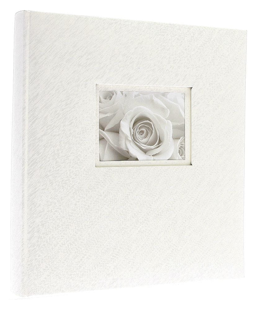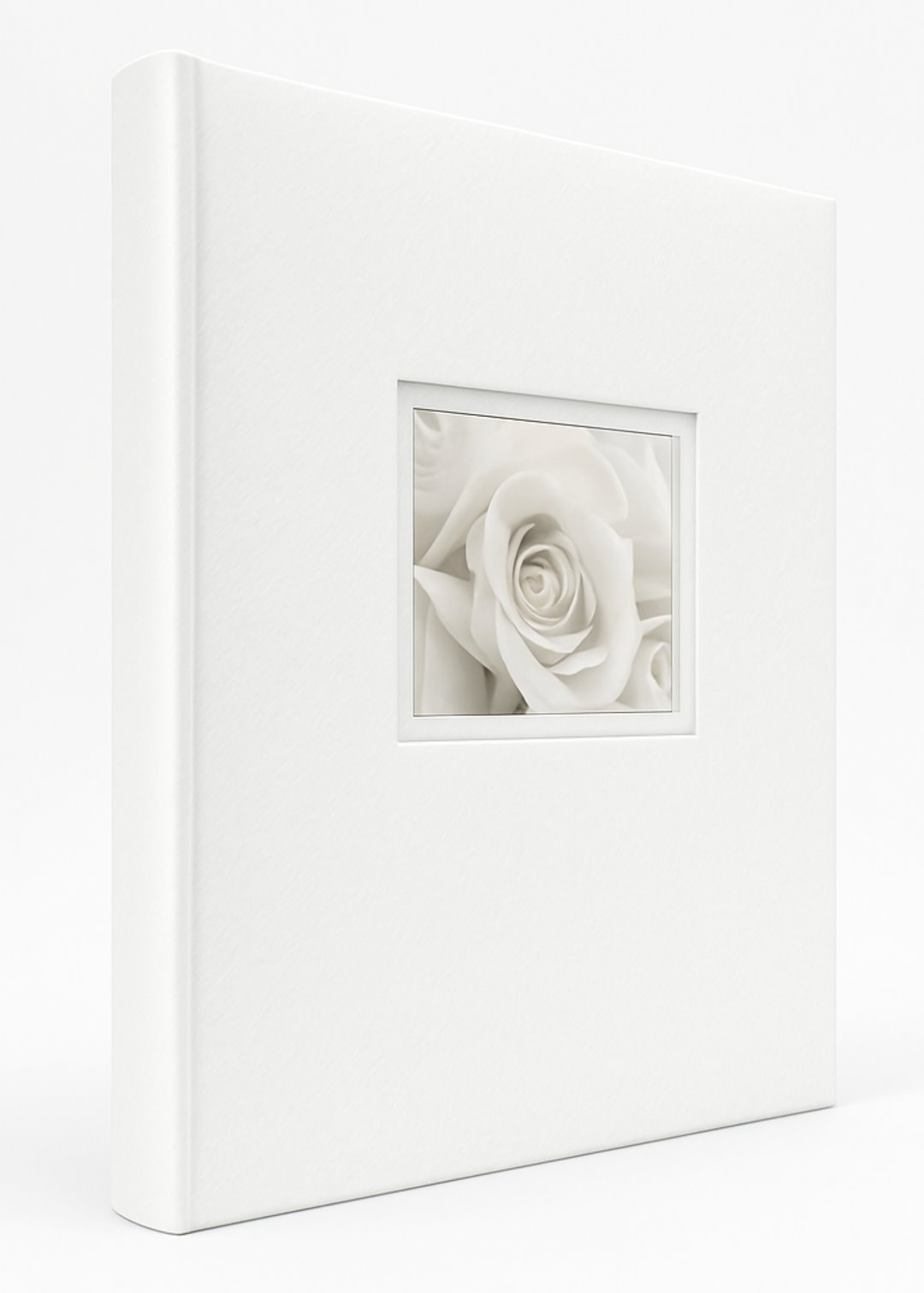 Album o prostej, minimalistycznej formie, który doskonale eksponuje wartość przechowywanych w nim wspomnień. Okładka została wykonana z wysokiej jakości białego papieru introligatorskiego o matowym wykończeniu i subtelnej, wyczuwalnej w dotyku fakturze. W jej centralnej części umieszczono kwadratowe, wpuszczane okienko, które pozwala na wstawienie własnego zdjęcia, nadając albumowi indywidualny i osobisty charakter.