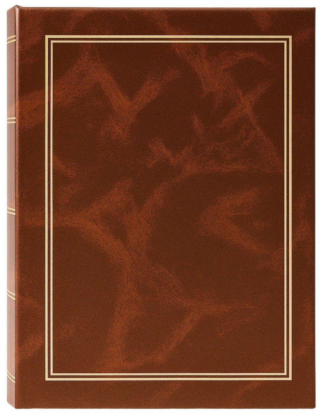 Okładkę wykonano z trwałej, brązowej okleiny winylowej, której faktura doskonale imituje wygląd naturalnej skóry. Centralnym punktem frontu jest subtelna, podwójna ramka w kolorze złota, która dodaje całości szlachetnego charakteru. Grzbiet, stylizowany na tradycyjną książkę z ozdobnymi, złotymi przetłoczeniami, podkreśla jego klasyczny styl.