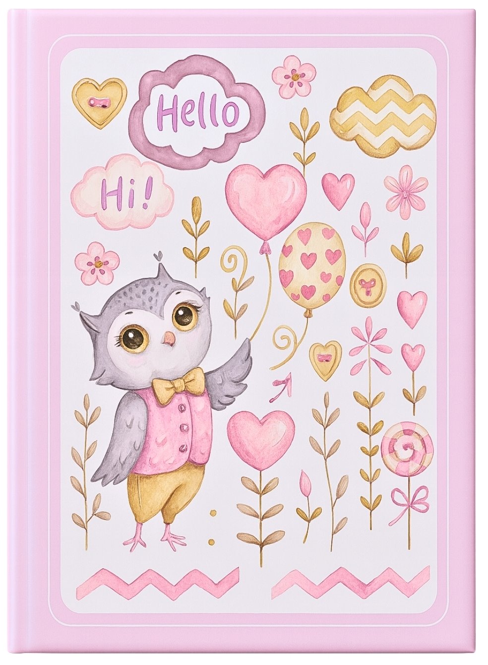 Okładka albumu wykonana jest z twardego, laminowanego papieru w odcieniu pastelowego różu. Centralnym punktem jest urocza, akwarelowa ilustracja przedstawiająca szarą sówkę w różowej kamizelce i złotej muszce. Grafika otoczona jest delikatnymi motywami – różowymi balonami w kształcie serc, złotymi gałązkami, małymi kwiatuszkami oraz napisami "Hello" i "Hi!". Całość utrzymana jest w ciepłej, dziecięcej stylistyce, która doskonale podkreśli charakter fotografii.