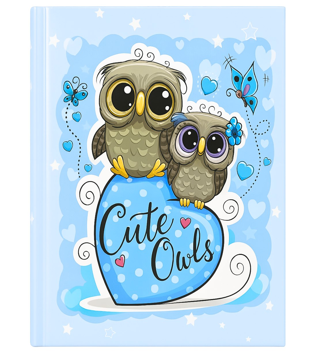 Okładka albumu wykonana jest z twardego, wytrzymałego papieru introligatorskiego, pokrytego gładkim, matowym laminatem, który chroni przed zabrudzeniami. Centralnym punktem jest urocza grafika przedstawiająca dwie sówki z dużymi oczami, siedzące na błękitnym sercu z napisem 'Cute Owls'. Tło w kolorze jasnoniebieskim zdobią delikatne, białe gwiazdki, dodając całości bajkowego charakteru.