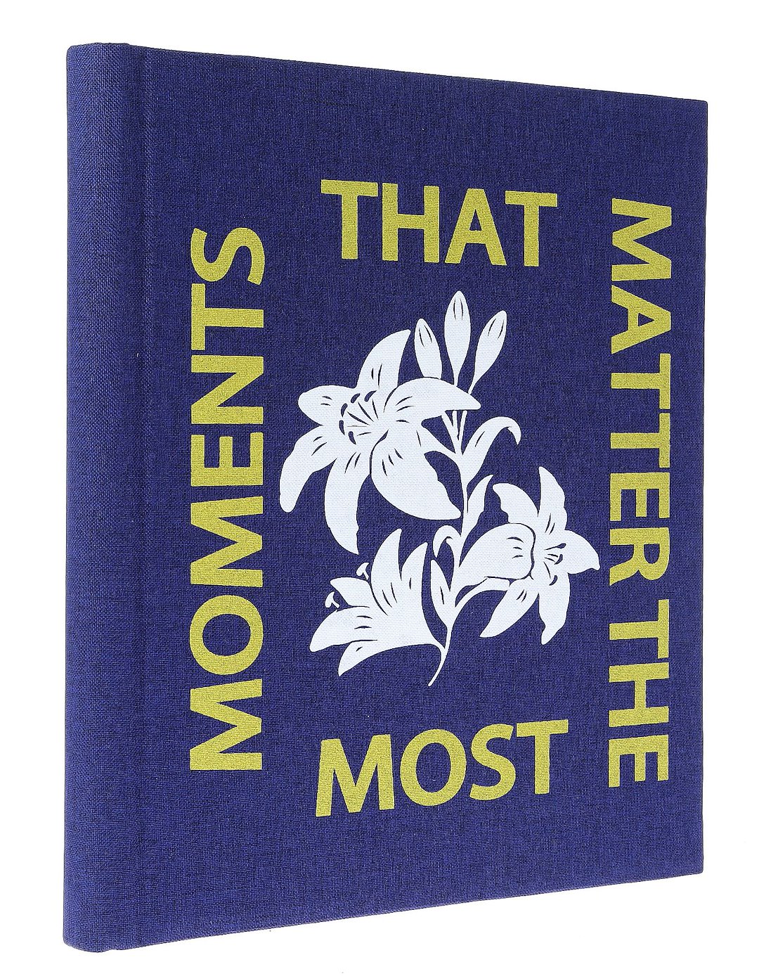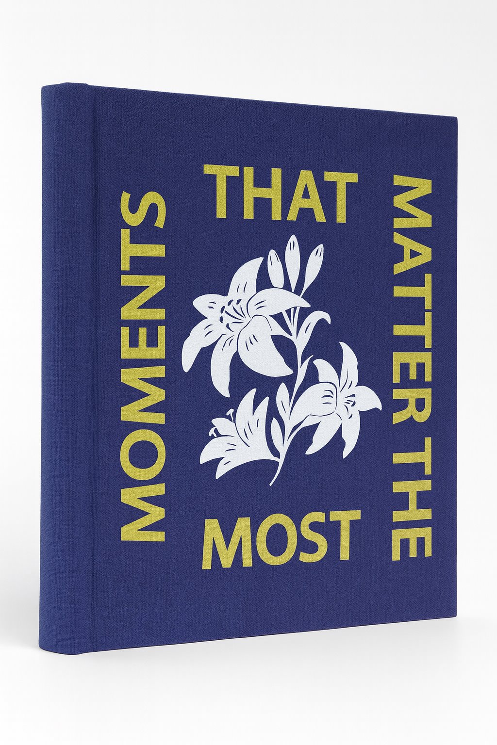 Okładka albumu została wykonana z wysokiej jakości tkaniny w głębokim, granatowym kolorze. Charakterystyczny splot płócienny nadaje jej szlachetnego wyglądu. Centralnym punktem jest złoty, typograficzny nadruk "Moments that matter the most" oraz subtelna grafika białych lilii, symbolizujących czystość i piękno chwil. Twarda oprawa i solidnie wykonany grzbiet zapewniają, że album będzie służył przez lata.