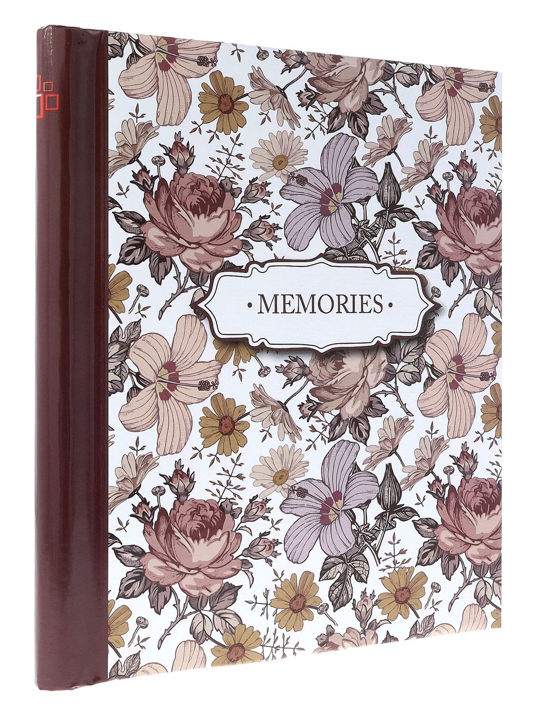 Okładka albumu wykonana jest z twardego, laminowanego papieru, co gwarantuje jej trwałość i odporność na uszkodzenia. Jasne tło zdobi gęsty, kwiatowy wzór w stonowanych odcieniach różu, fioletu i pomarańczu, nadając całości nostalgiczny charakter. Kontrastujący, jednolity grzbiet w głębokim, bordowym kolorze dodaje elegancji i podkreśla solidną konstrukcję. Centralnym punktem okładki jest ozdobny szyld z napisem "MEMORIES", zapraszający do wypełnienia wnętrza wspomnieniami.