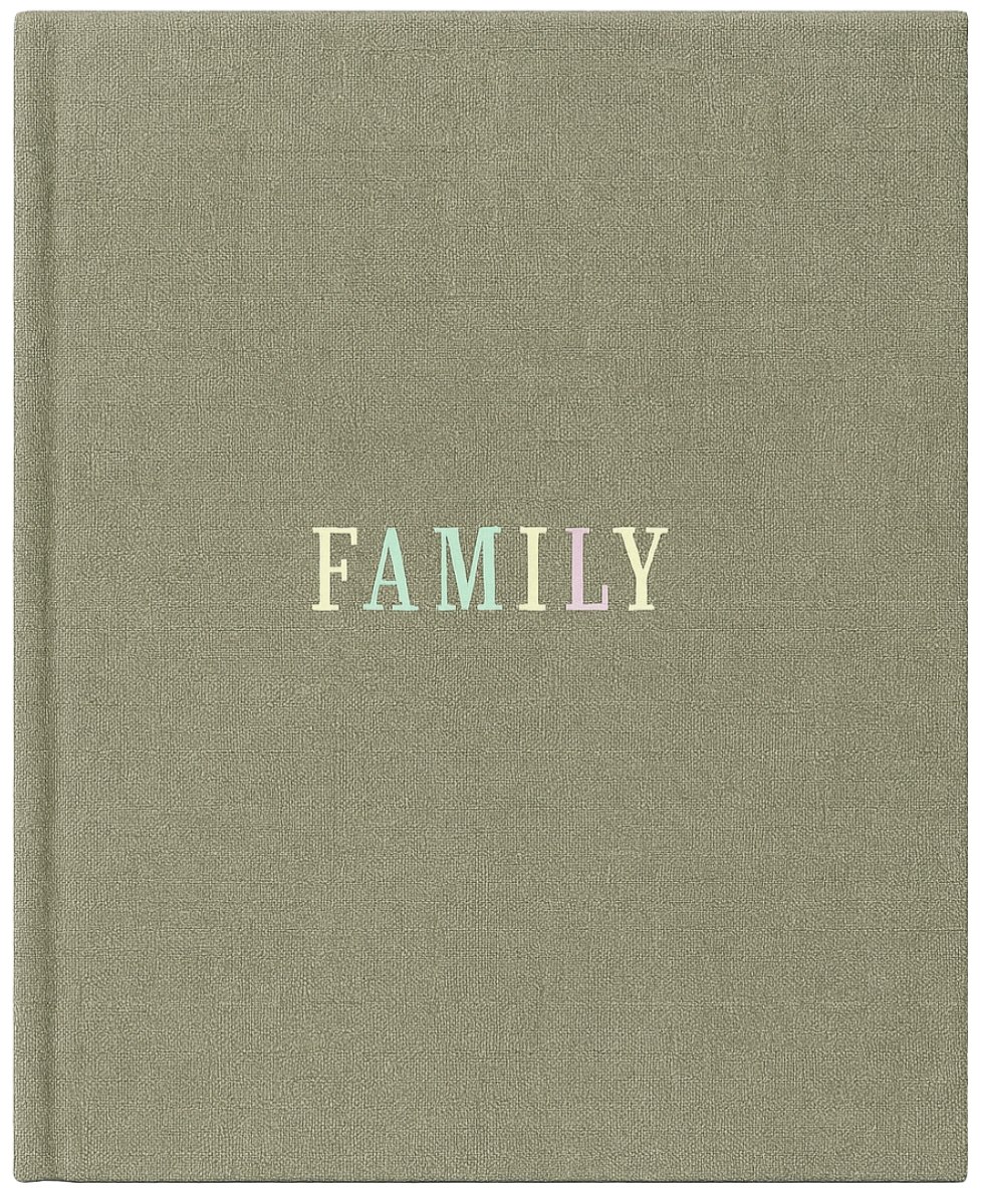 Ten album to coś więcej niż tylko miejsce na zdjęcia – to puste płótno dla Twoich rodzinnych historii. Okładka, wykonana z materiału o wyraźnej, płóciennej fakturze w odcieniu szałwiowej zieleni, jest przyjemna w dotyku i trwała. Centralnie umieszczony napis 'FAMILY', złożony z pastelowych liter, dodaje całości subtelnego uroku i podkreśla przeznaczenie albumu.
