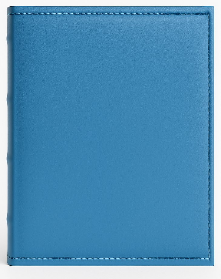 Okładka została wykonana z wysokiej jakości skóry ekologicznej, która jest zarówno trwała, jak i łatwa w utrzymaniu czystości. Charakterystycznym elementem jest ozdobne, jasne przeszycie wzdłuż wszystkich krawędzi, które kontrastuje z głębią niebieskiego koloru i dodaje elegancji. Garbowany, szyty grzbiet nie tylko wygląda efektownie, ale przede wszystkim gwarantuje, że album będzie służył przez wiele lat, nawet przy częstym użytkowaniu.