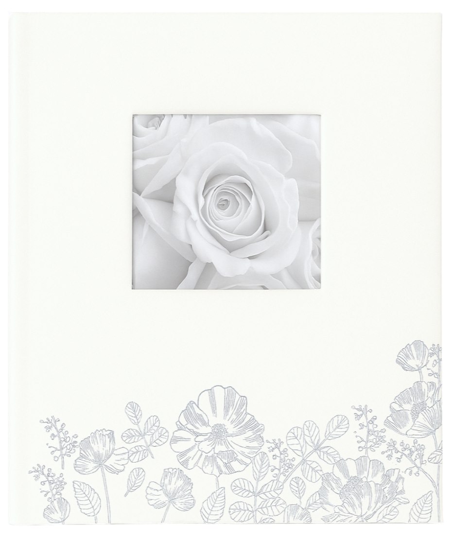 Okładka wykonana z wysokiej jakości białej skóry ekologicznej jest gładka i przyjemna w dotyku. Jej minimalistyczny charakter przełamuje subtelny, srebrny wzór przedstawiający polne kwiaty, umieszczony w dolnej części. Centralnym punktem jest kwadratowe okienko, które pozwala na personalizację albumu ulubionym zdjęciem, nadając mu unikalny, osobisty charakter.