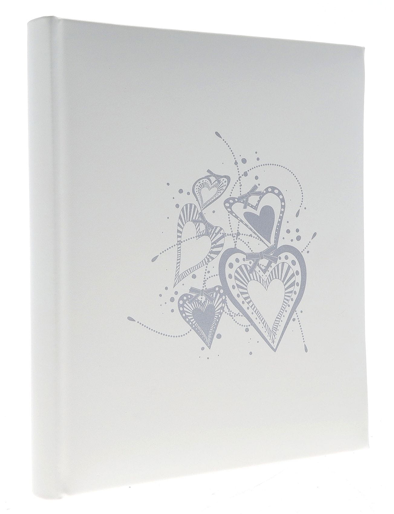 Okładka albumu wykonana jest z gładkiej, białej ekoskóry, która jest przyjemna w dotyku i łatwa w utrzymaniu czystości. Centralnym punktem jest artystyczna grafika przedstawiająca kompozycję stylizowanych serc, naniesiona metodą srebrnego, błyszczącego druku. Ten subtelny, ale wyrazisty detal nadaje albumowi romantycznego charakteru, idealnie pasując do podniosłych chwil.