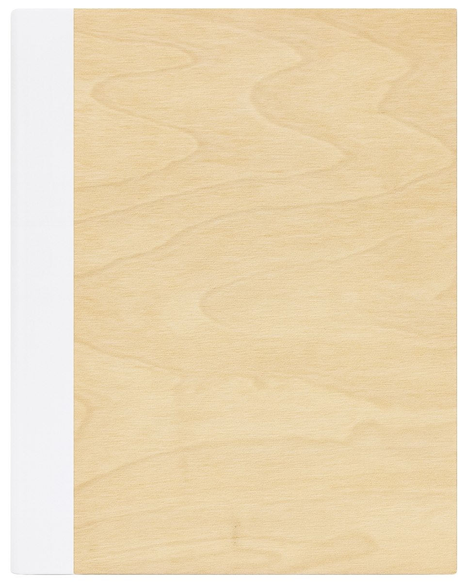 Front okładki wykonano z jednego kawałka jasnego drewna, którego powierzchnię zdobi niepowtarzalny, naturalny wzór usłojenia. Każdy egzemplarz jest dzięki temu jedyny w swoim rodzaju. Gładka faktura drewna jest przyjemna w dotyku, a jego ciepły odcień doskonale komponuje się z bielą grzbietu.
