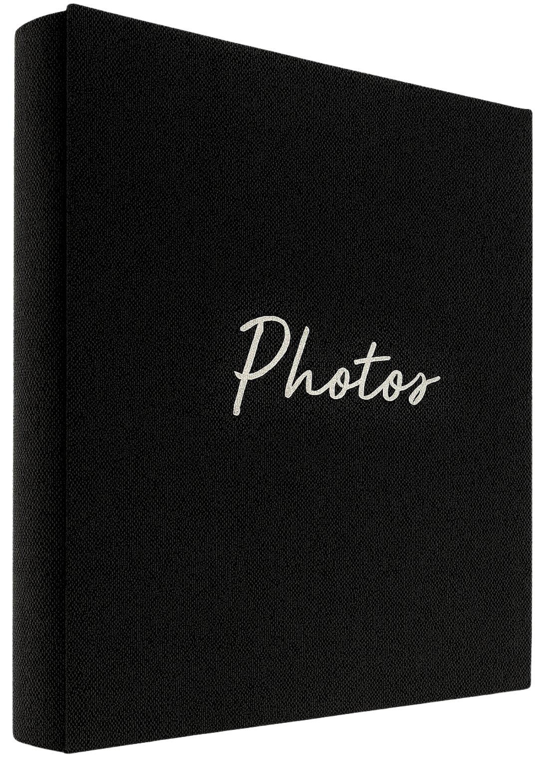 Prezentujemy album tradycyjny, który łączy nowoczesny minimalizm z klasyczną formą. Okładka wykonana została z wysokiej jakości czarnej tkaniny o wyraźnej, plecionej fakturze imitującej naturalny len. Centralnym punktem jest subtelny, biały napis "Photos" wykonany czcionką przypominającą odręczne pismo, co dodaje całości osobistego charakteru.