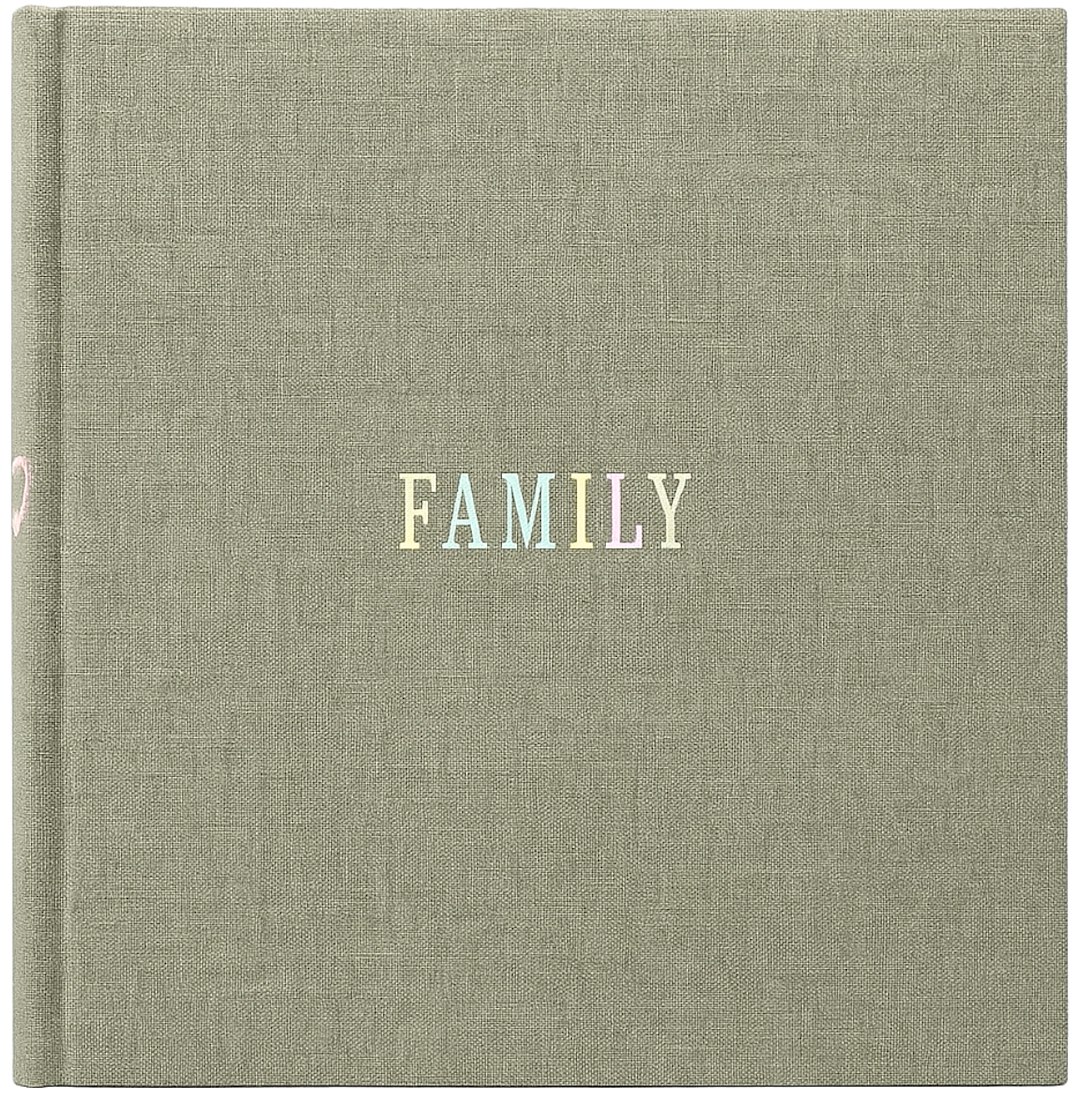 Okładkę albumu pokrywa wysokiej jakości tkanina introligatorska w kolorze szałwiowej zieleni, której faktura wiernie imituje naturalny len. Jest przyjemna w dotyku i odporna na codzienne użytkowanie. Centralnym punktem jest napis 'FAMILY', wykonany techniką tłoczenia z użyciem tęczowej, mieniącej się folii. Zależnie od kąta padania światła, litery subtelnie zmieniają kolor, nadając całości unikalnego charakteru.