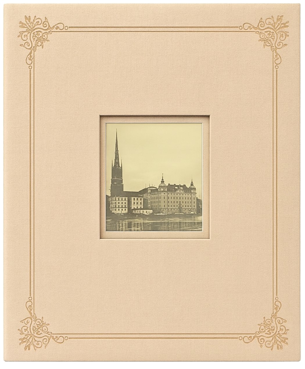 Okładka albumu została wykonana z wysokiej jakości materiału introligatorskiego o wyraźnej, płóciennej fakturze w subtelnym, beżowym kolorze. Centralnie umieszczone, precyzyjnie wycięte okienko pozwala na umieszczenie własnej fotografii, nadając albumowi indywidualny charakter. Całość zdobią tłoczone na gorąco, złote ornamenty w narożnikach oraz cienka ramka, które dodają całości szlachetnego wyglądu.