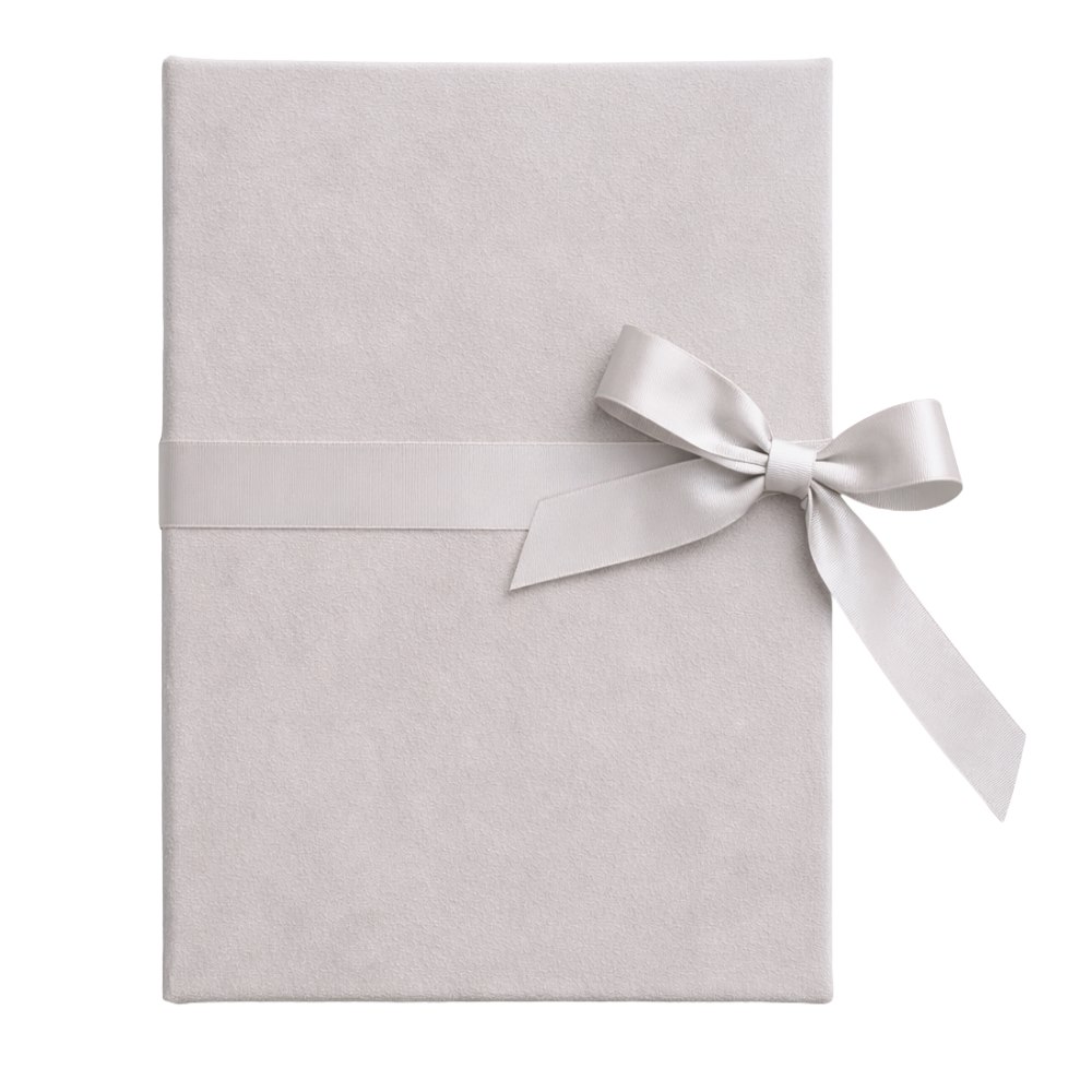Okładkę albumu pokrywa wysokiej jakości welur artystyczny (art velvet) w subtelnym, gołębim odcieniu szarości. Materiał jest niezwykle przyjemny w dotyku, a jego matowa faktura pięknie rozprasza światło, nadając całości luksusowego charakteru. Całość dopełnia szeroka, satynowa wstążka w idealnie dopasowanym kolorze, zawiązana w staranną kokardę. To detal, który czyni ten album wyjątkowym i gotowym do wręczenia jako prezent.
