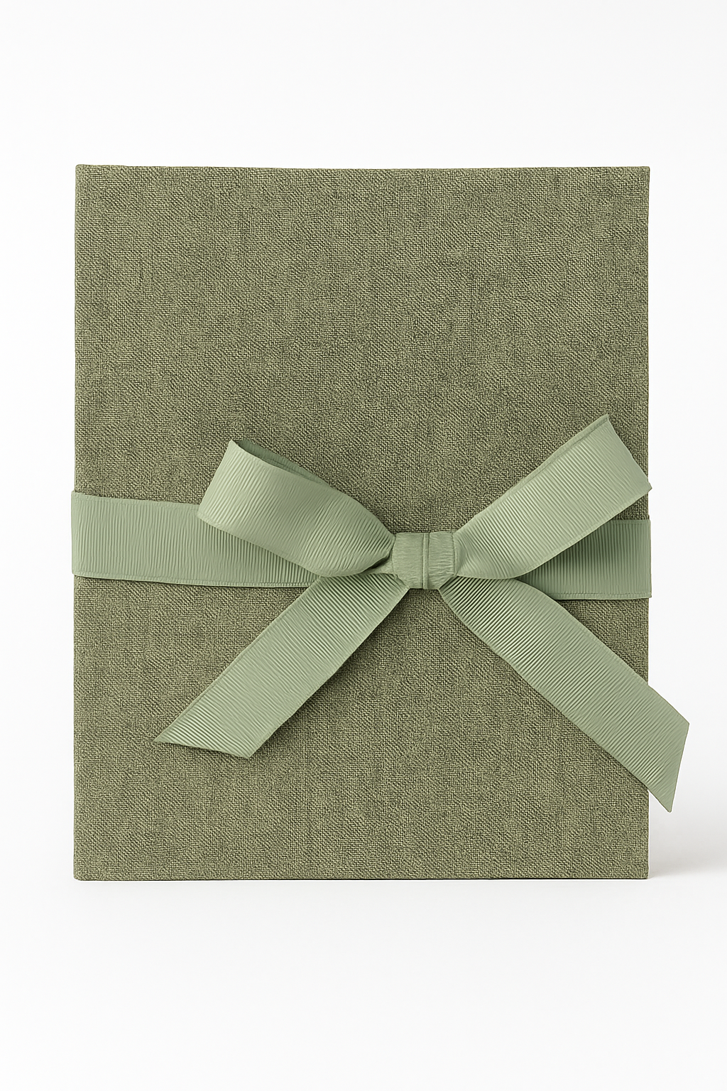 Okładka albumu została wykonana z wysokiej jakości twardej tektury, pokrytej tkaniną w kolorze głębokiej oliwki. Wyraźnie widoczny, gruby splot materiału imituje naturalny len, nadając całości szlachetny i przyjemny w dotyku charakter. Całość dopełnia szeroka, rypsowa wstążka w jaśniejszym, szałwiowym odcieniu, która służy do eleganckiego zamknięcia albumu.