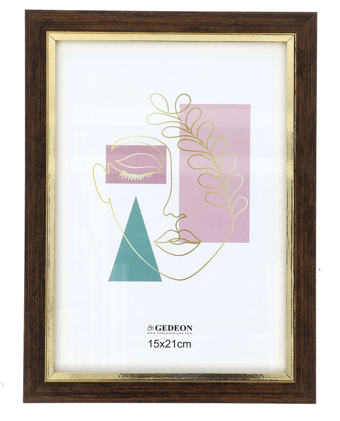 Ramka charakteryzuje się głębokim, ciemnobrązowym kolorem i wyraźnie zaznaczoną fakturą imitującą naturalne słoje drewna. Ten solidny profil został przełamany wewnętrzną, cienką listwą w kolorze lśniącego złota. Kontrast między matową strukturą drewna a połyskującym złotem tworzy wyrafinowany i przyciągający wzrok efekt.