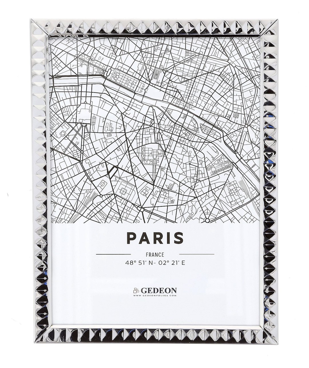 To, co wyróżnia ten model, to jego unikalna, fasetowana rama. Składa się ona z dziesiątek małych, geometrycznych ostrosłupów, które tworzą dynamiczną i intrygującą fakturę. Dzięki takiemu wykończeniu ramka pięknie odbija światło, tworząc subtelną grę refleksów i cieni, która ożywia otoczenie i skupia uwagę na umieszczonym w niej zdjęciu.