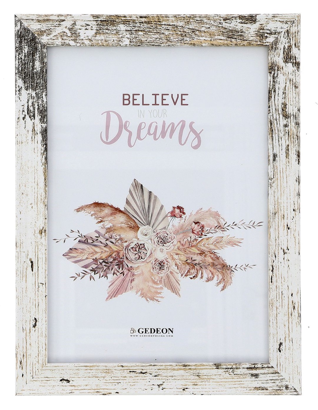 Ramka została wykonana z drewna i pokryta białą farbą, a następnie poddana procesowi przecierania. Dzięki temu na jej powierzchni widoczne są nieregularne, ciemniejsze fragmenty, które eksponują naturalną fakturę drewna i tworzą unikalny, wiekowy wygląd. Każdy egzemplarz jest jedyny w swoim rodzaju ze względu na ręczny charakter wykończenia.