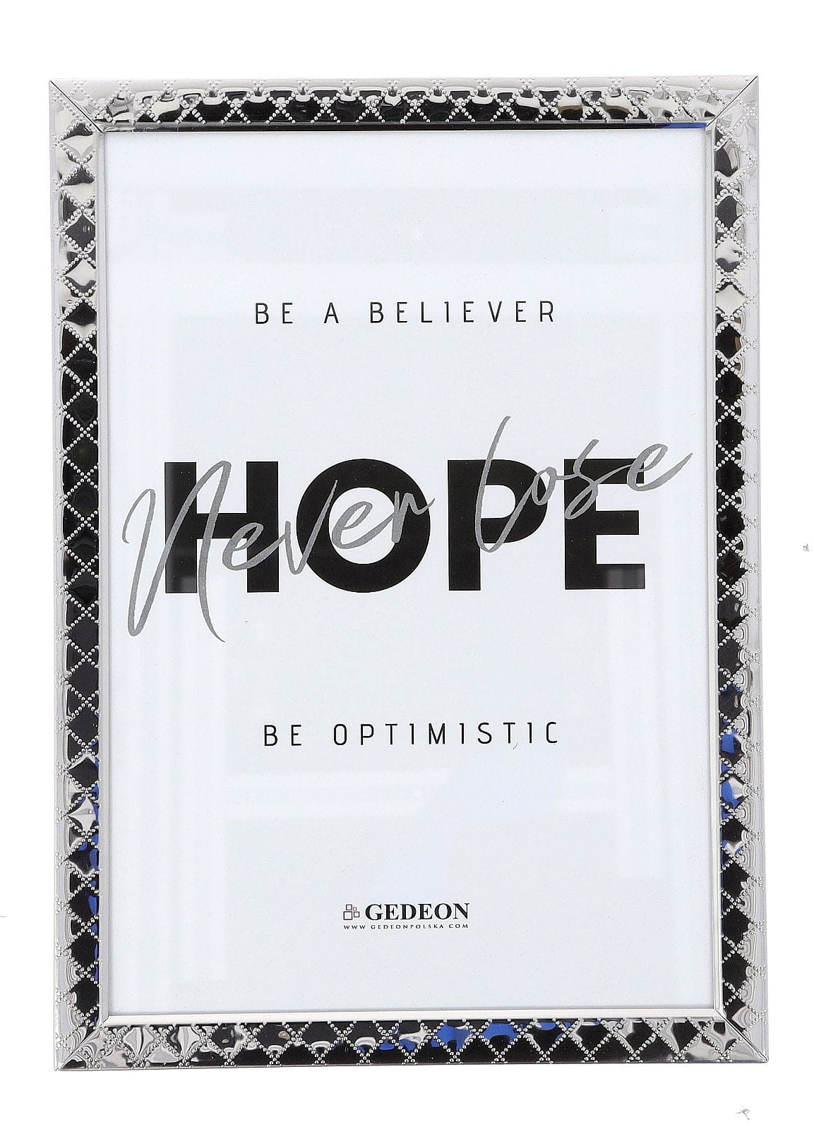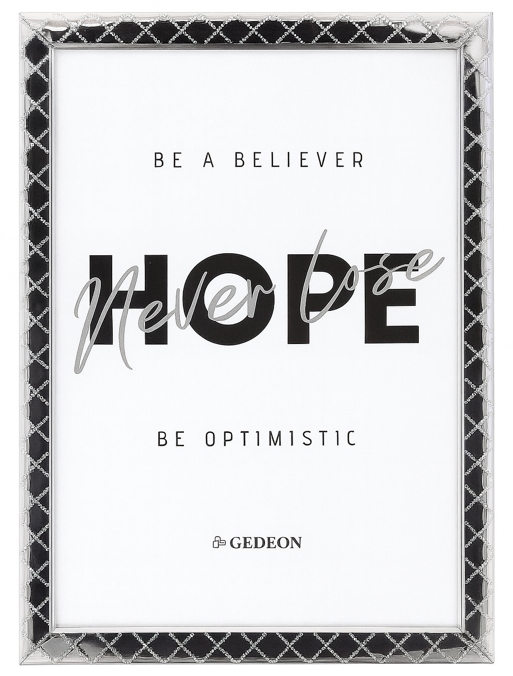 Prezentujemy metalową ramkę na zdjęcia Gedeon w rozmiarze 15x21 cm, która łączy w sobie nowoczesny design i styl glamour. Jej najbardziej charakterystycznym elementem jest szeroka, lustrzana rama ozdobiona precyzyjnym, brokatowym wzorem w kształcie rombów, osadzonym na kontrastującym, czarnym tle. Ta unikalna faktura pięknie odbija światło, dodając wnętrzu elegancji i blasku.