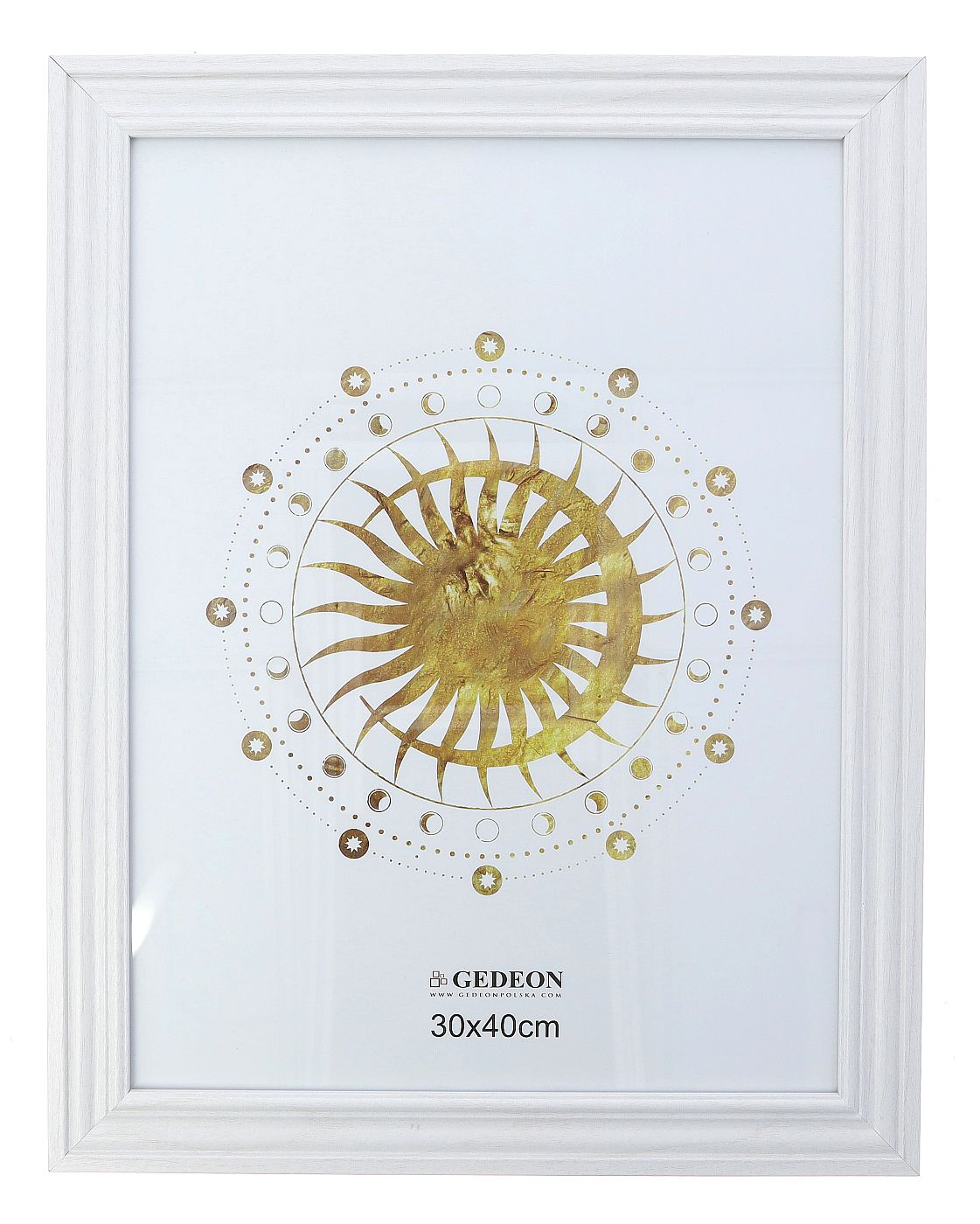 Ramka została wykonana z litego drewna, co gwarantuje jej sztywność i trwałość. Szeroka, profilowana listwa nadaje jej solidnego wyglądu i sprawia, że staje się ona wyrazistym elementem dekoracyjnym. Front zabezpieczony jest lekką i nietłukącą się płytą z pleksi, która chroni pracę przed kurzem i uszkodzeniami, zapewniając jednocześnie doskonałą przejrzystość. Z tyłu znajdują się obrotowe klipsy ułatwiające szybką i bezproblemową wymianę zdjęcia oraz zawieszki do montażu w pionie i poziomie.