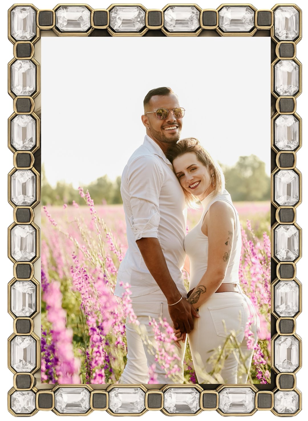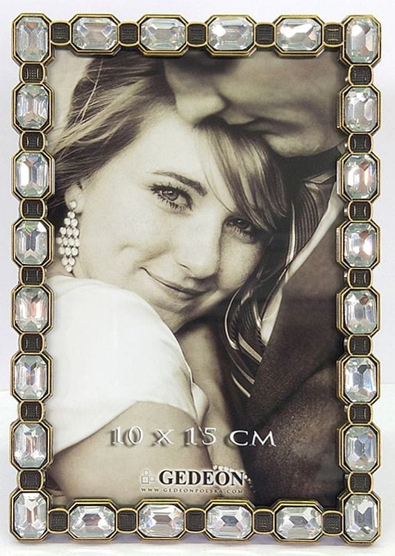 Ramka została wykonana z wysokiej jakości metalu. Jej głównym atutem jest bogate zdobienie w postaci dużych, prostokątnych, szlifowanych kryształów, które pięknie odbijają światło, tworząc efekt biżuteryjnego blasku. Kryształy osadzone są w oprawie o złotym wykończeniu, a przestrzeń między nimi wypełniają elementy o ciemnoszarej, teksturowanej powierzchni. To połączenie kolorów i faktur nadaje ramce głębi i niezwykle eleganckiego charakteru.