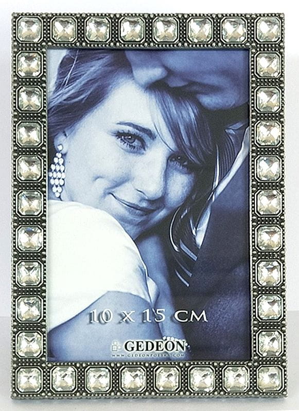 Ramka została wykonana z wysokiej jakości metalu o wykończeniu w kolorze postarzanego, ciemnego srebra. Jej powierzchnia ma unikalną, kuleczkową fakturę, która pięknie odbija światło. Głównym elementem dekoracyjnym jest pojedynczy rząd dużych, kwadratowych kryształów o szlifie fasetowym, które otaczają całą ramkę, tworząc efekt biżuteryjnej precyzji.